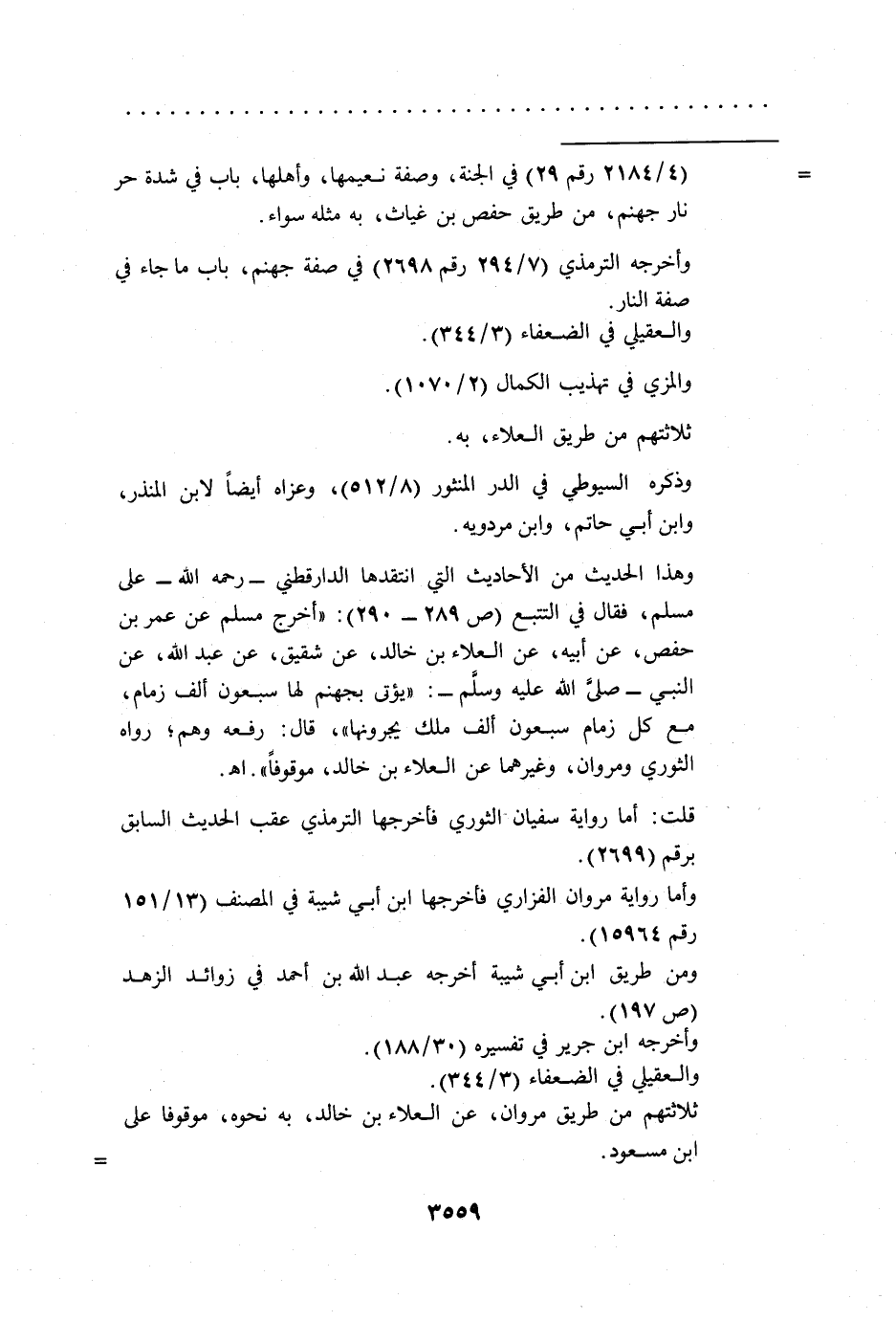 وهذا الحديث من الأحاديث التي انتقدها الدارقطني -رحمه الله- على مسلم، فقال في التتبع (ص 289 - 290): "أخرج مسلم عن عمر بن حفص، عن أبيه، عن العلاء بن خالد، عن شقيق، عن عبد الله، عن النبي -صلى الله عليه وسلم-: "يؤتى بجهنم لها سبعون ألف زمام، مع كل زمام سبعون ألف ملك يجرونها"، قال: رفعه وهم؛ رواه الثوري ومروان، وغيرهما عن العلاء بن خالد، موقوفاً". اهـ.