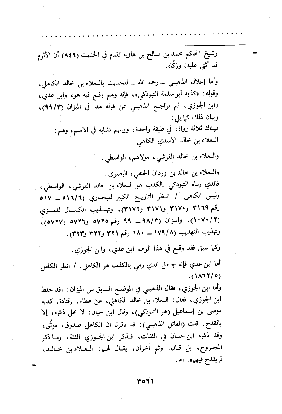 وأما ابن الجوزي، فقال الذهبي في الموضع السابق من الميزان: "قد خلط ابن الجوزي، فقال: العلاء بن خالد الكاهلي، عن عطاء، وقتادة، كذبه موسى بن إسماعيل (هو التبوذكي)، وقال ابن حبان: لا يحل ذكره، إلا بالقدح. قلت (القائل الذهبي): قد ذكرنا أن الكاهلي صدوق، موثق، وقد ذكره ابن حبان في الثقات، فذكر ابن الجوزي الثقة، وما ذكر المجروح، بل قال: وثم آخران، يقال لهما: العلاء بن خالد، لم يقدح فيهما". اهـ. =