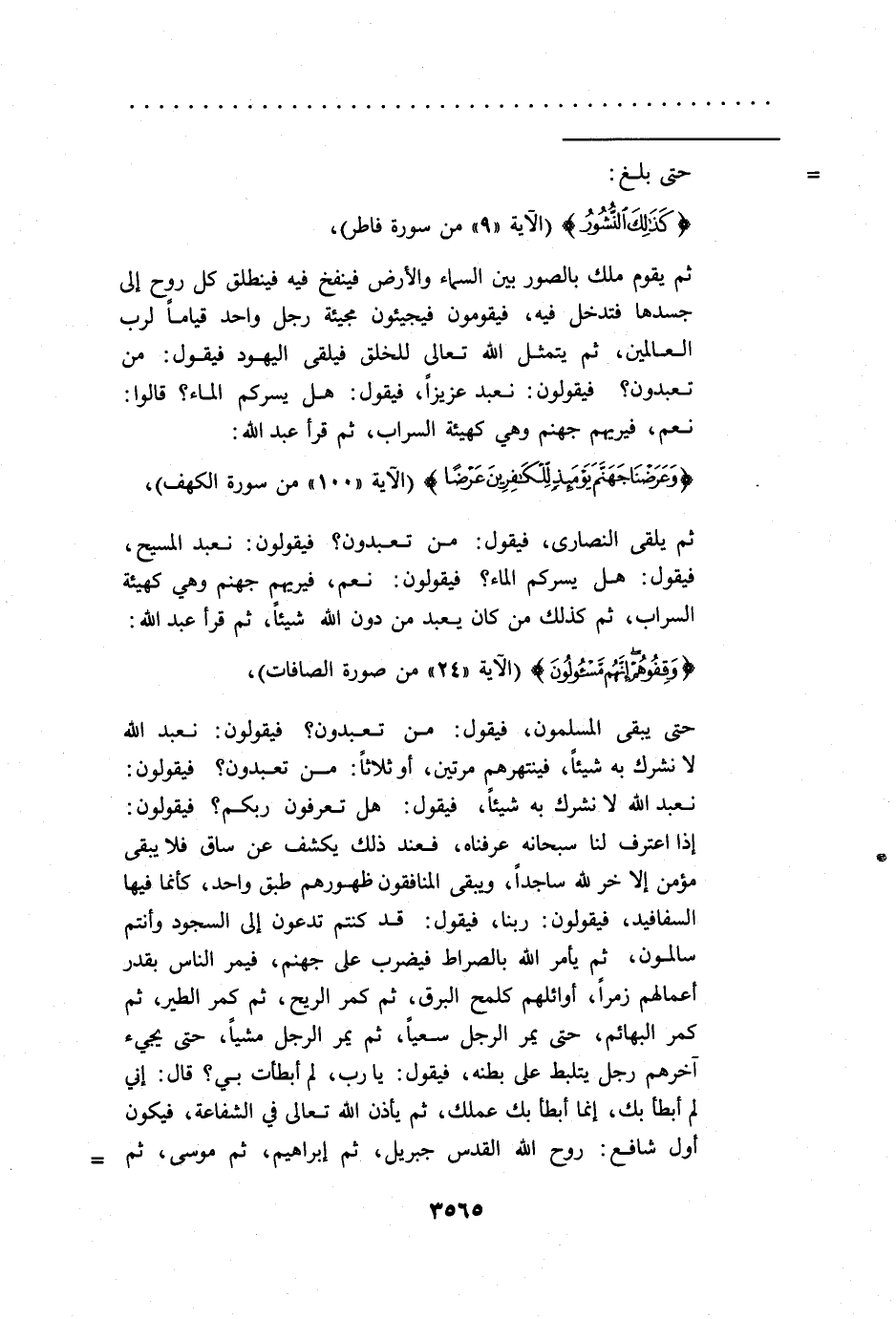 حتى يبقى المسلمون، فيقول: من تعبدون؟ فيقولون: نعبد الله لا نشرك به شيئاً، فينتهرهم مرتين، أو ثلاثاً: من تعبدون؟ فيقولون: نعبد الله لا نشرك به شيئاً، فيقول: هل تعرفون ربكم؟ فيقولون: إذا اعترف لنا سبحانه عرفناه، فعند ذلك يكشف عن ساق فلا يبقى مؤمن إلا خر لله ساجداً، ويبقى المنافقون ظهورهم طبق واحد، كأنما فيها السفافيد، فيقولون: ربنا، فيقول: قد كنتم تدعون إلى السجود وأنتم سالمون، ثم يأمر الله بالصراط فيضرب على جهنم، فيمر الناس بقدر أعمالهم زمراً، أوائلهم كلمح البرق، ثم كمر الريح، ثم كمر الطير، ثم كمر البهائم، حتى يمر الرجل سعياً، ثم يمر الرجل مشياً، حتى يجيء آخرهم رجل يتلبط على بطنه، فيقول: يا رب، لم أبطأت بي؟ قال: إني لم أبطأ بك، إنما أبطأ بك عملك، ثم يأذن الله تعالى في الشفاعة، فيكون أول شافع: روح الله القدس جبريل، ثم إبراهيم، ثم موسى، ثم =