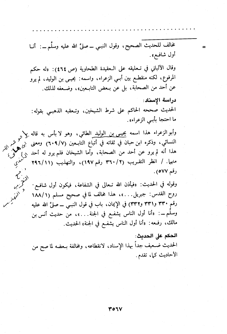 وقال الألباني في تعليقه على العقيدة الطحاوية (ص 464): "له حكم المرفوع، لكنه منقطع بين أبي الزعراء، واسمه: يحيى بن الوليد، لم يرو عن أحد من الصحابة، بل عن بعض التابعين"، وضعفه لذلك.