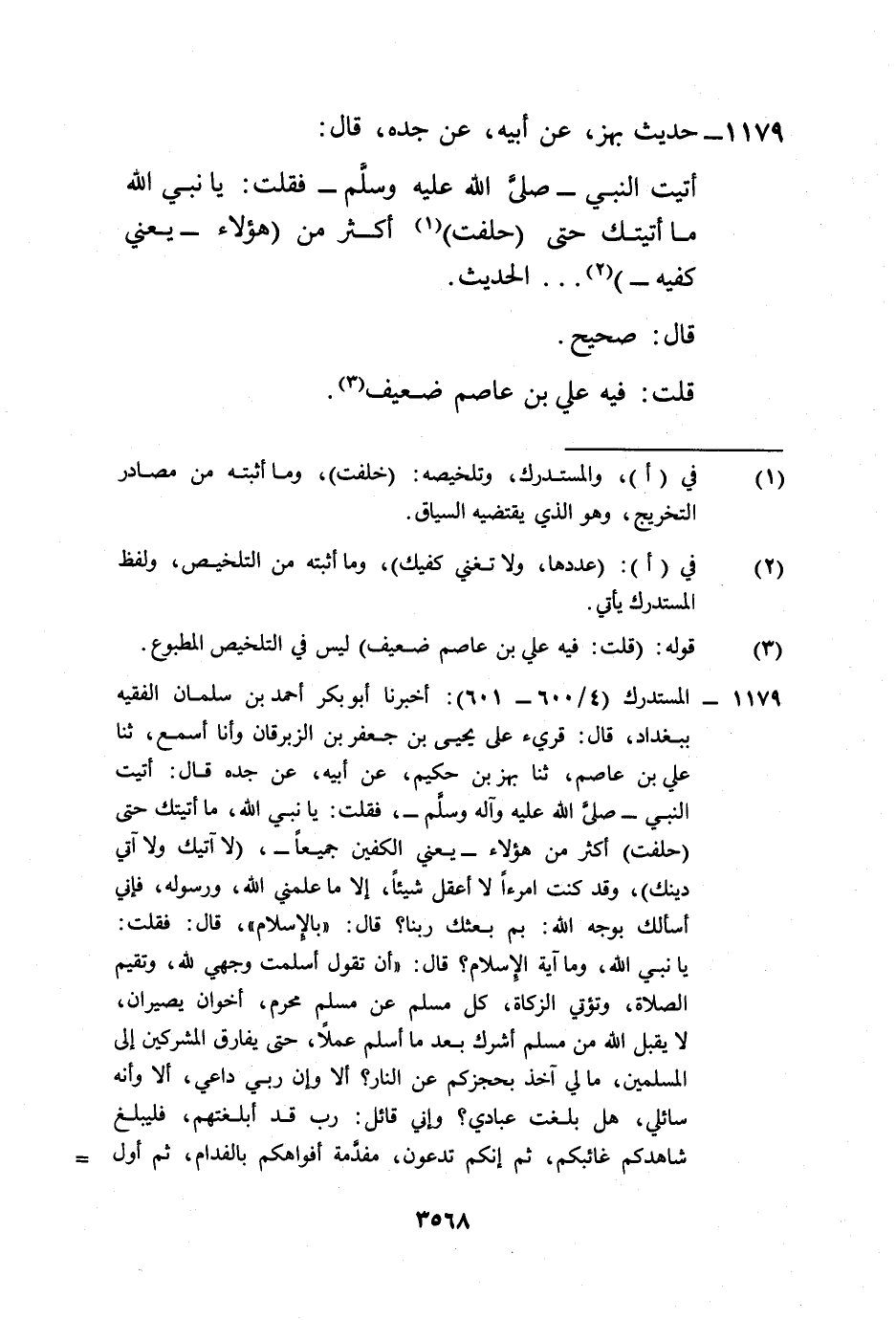 1179 - المستدرك (4/ 600 - 601): أخبرنا أبو بكر أحمد بن سلمان الفقيه ببغداد، قال: قريء على يحيى بن جعفر بن الزبرقان وأنا أسمع، ثنا علي بن عاصم، ثنا بهز بن حكيم، عن أبيه، عن جده قال: أتيت النبي -صلى الله عليه وآله وسلم-، فقلت: يا نبي الله، ما أتيتك حتى (حلفت) أكثر من هؤلاء -يعني الكفين جميعاً-، (لا آتيك ولا آتي دينك)، وقد كنت امرءاً لا أعقل شيئاً، إلا ما علمني الله، ورسوله، فإني أسألك بوجه الله: بم بعثك ربنا؟ قال: "بالإسلام"، قال: فقلت: يا نبي الله، وما آية الإِسلام؟ قال: "أن تقول أسلمت وجهي لله، وتقيم الصلاة، وتؤتي الزكاة، كل مسلم عن مسلم محرم، أخوان يصيران، لا يقبل الله من مسلم أشرك بعد ما أسلم عملاً، حتى يفارق المشركين إلى المسلمين، ما لي آخذ بحجزكم عن النار؟ ألا وإن ربي داعي، ألا وأنه سائلي، هل بلغت عبادي؟ وإني قائل: رب قد أبلغتهم، فليبلغ شاهدكم غائبكم، ثم إنكم تدعون، مفدمة أفواهكم بالفدام، ثم أول =