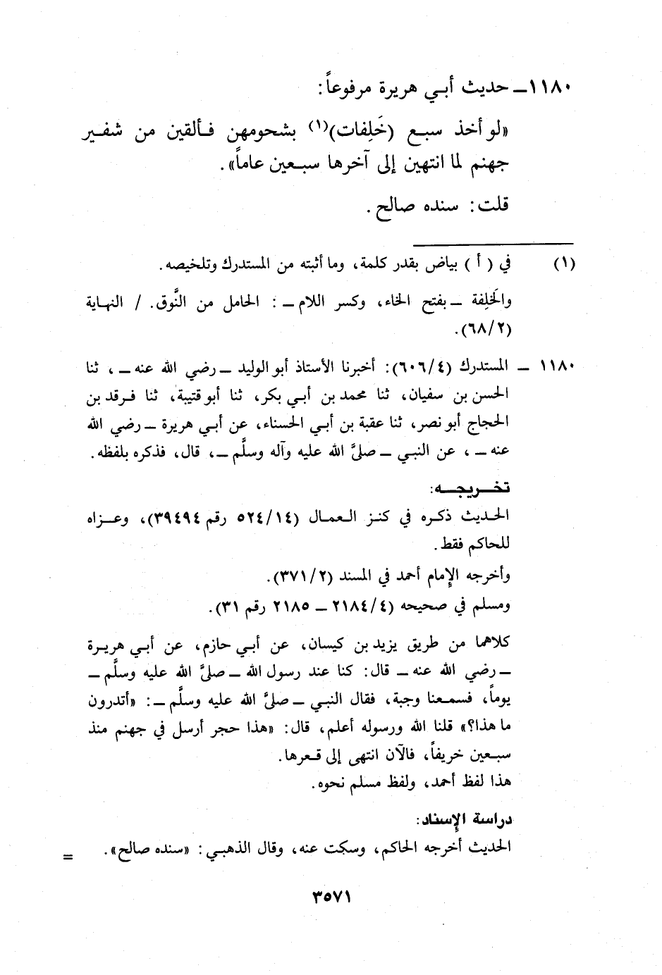 1180 - المستدرك (4/ 606): أخبرنا الأستاذ أبو الوليد -رضي الله عنه-، ثنا الحسن بن سفيان، ثنا محمد بن أبي بكر، ثنا أبو قتيبة، ثنا فرقد بن الحجاج أبو نصر، ثنا عقبة بن أبي الحسناء، عن أبي هريرة -رضي الله عنه-، عن النبي -صلى الله عليه وآله وسلم-، قال، فذكره بلفظه.