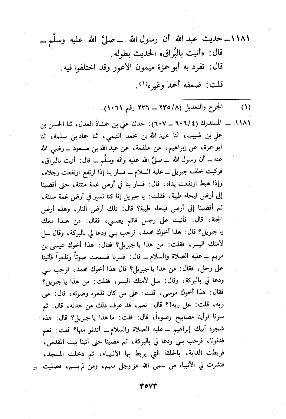 1181 - المستدرك (4/ 606 - 607): حدثنا علي بن حمشاذ العدل، ثنا الحسن بن علي بن شبيب، ثنا عبيد الله بن محمد التيمي، ثنا حماد بن سلمة، ثنا أبو حمزة، عن إبراهيم، عن علقمة، عن عبد الله بن مسعود -رضي الله عنه- أن رسول الله -صلى الله عليه وآله وسلم- قال: أتيت بالبراق، فركبت خلف جبريل -عليه السلام- فسار بنا إذا ارتفع ارتفعت رجلاه، وإذا هبط ارتفعت يداه، قال: فسار بنا في أرض غمة منتنة، حتى أفضينا إلى أرض فيحاء طيبة، فقلت: يا جبريل إنا كنا نسير في أرض غمة منتنة، ثم أفضينا إلى أرض فيحاء طيبة؟ قال: تلك أرض النار، وهذه أرض الجنة، قال: فأتيت على رجل قائم يصلي، فقال: من هذا معك يا جبريل؟ قال: هذا أخوك محمد، فرحب بي ودعا لي بالبركة، وقال سل لأمتك اليسر، فقلت: من هذا يا جبريل؟ فقال: هذا أخوك عيسى بن مريم -عليه الصلاة والسلام- قال: فسرنا فسمعت صوتاً وتذمراً فأتينا على رجل، فقال: من هذا يا جبريل؟ قال هذا أخوك محمد، فرحب بي ودعا لي بالبركة، وقال: سل لأمتك اليسر، فقلت: من هذا يا جبريل؟ فقال: هذا أخوك موسى، قلت: على من كان تذمره وصوته، قال: على ربه، قلت: على ربه!؟ قال: نعم، قد عرف ذلك من حدته، قال: ثم سرنا فرأينا مصابيح وضوءاً، قال: قلت: ما هذا يا جبريل؟ قال: هذه شجرة أبيك إبراهيم -عليه الصلاة والسلام- أتدنو منها؟ قلت: نعم فدنونا، فرحب بي ودعا لي بالبركة، ثم مضينا حتى أتينا بيت المقدس، فربطت الدابة، بالحلقة التي يربط بها الأنبياء، ثم دخلت المسجد، فنشرت لي الأنبياء من سمى الله عز وجل منهم، ومن لم يسم، فصليت =