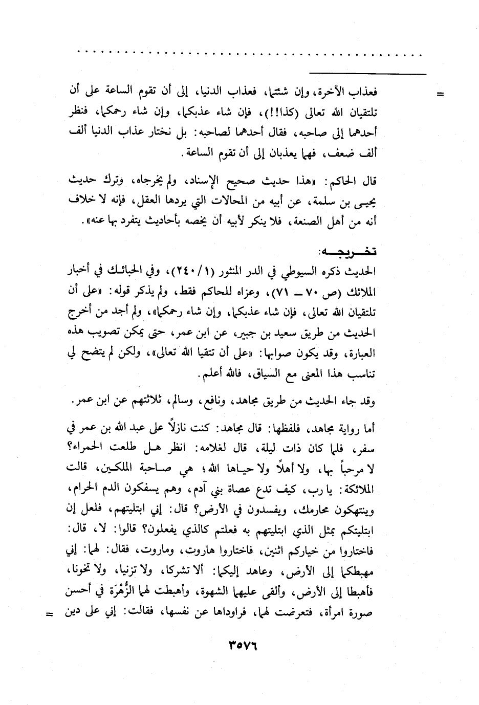 أما رواية مجاهد، فلفظها: قال مجاهد: كنت نازلًا على عبد الله بن عمر في سفر، فلما كان ذات ليلة، قال لغلامه: انظر هل طلعت الحمراء؟ لا مرحباً بها، ولا أهلًا ولا حياها الله؛ هي صاحبة الملكين، قالت الملائكة: يا رب، كيف تدع عصاة بني آدم، وهم يسفكون الدم الحرام، وينتهكون محارمك، ويفسدون في الأرض؟ قال: إني ابتليتهم، فلعل إن ابتليتكم بمثل الذي ابتليتهم به فعلتم كالذي يفعلون؟ قالوا: لا، قال: فاختاروا من خياركم اثنين، فاختاروا هاروت، وماروت، فقال: لهما: إني مهبطكما إلى الأرض، وعاهد إليكما: ألا تشركا، ولا تزنيا، ولا تخونا، فأهبطا إلى الأرض، وألقى عليهما الشهوة، وأهبطت لهما الزُهْرَة في أحسن صورة امرأة، فتعرضت لهما، فراوداها عن نفسها، فقالت: إني على دين =