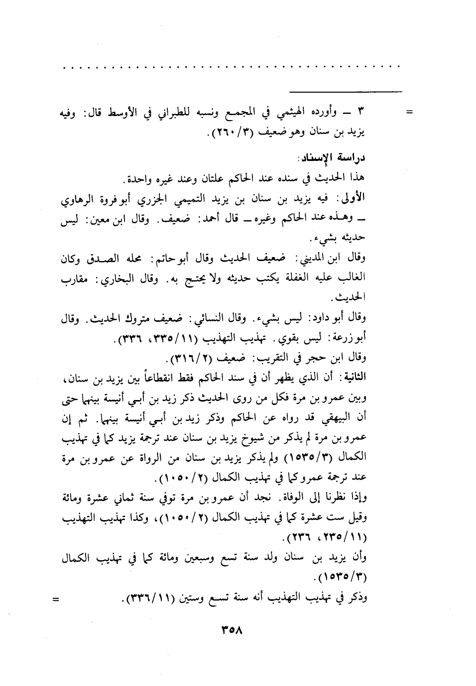 الثانية: أن الذي يظهر أن في سند الحاكم فقط انقطاعاً بين يزيد بن سنان، وبين عمرو بن مرة فكل من روى الحديث ذكر زيد بن أبي أنيسة بينهما حتى أن البيهقي قد رواه عن الحاكم وذكر زيد بن أبي أنيسة بينهما. ثم إن عمرو بن مرة لم يذكر من شيوخ يزيد بن سنان عند ترجمة يزيد كما في تهذيب الكمال (3/ 1535) ولم يذكر يزيد بن سنان من الرواة عن عمرو بن مرة عند ترجمة عمرو كما في تهذيب الكمال (2/ 1050).