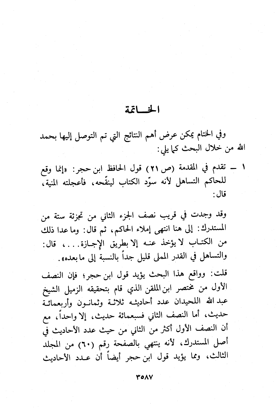 قلت: وواقع هذا البحث يؤيد قول ابن حجر؛ فإن النصف الأول من مختصر ابن الملقن الذي قام بتحقيقه الزميل الشيخ عبد الله اللحيدان عدد أحاديثه ثلاثة وثمانون وأربعمائة حديث، أما النصف الثاني فسبعمائة حديث، إلا واحداً، مع أن النصف الأول أكثر من الثاني من حيث عدد الأحاديث في أصل المستدرك، لأنه ينتهي بالصفحة رقم (60) من المجلد الثالث، ومما يؤيد قول ابن حجر أيضاً أن عدد الأحاديث