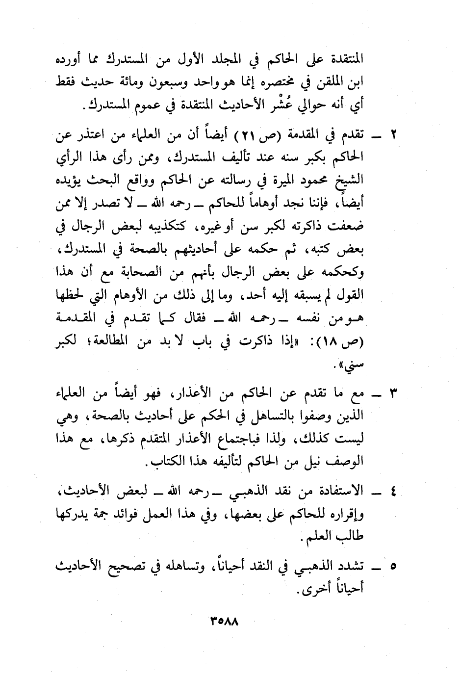 2 - تقدم في المقدمة (ص 21) أيضاً أن من العلماء من اعتذر عن الحاكم بكبر سنه عند تأليف المستدرك، وممن رأى هذا الرأي الشيخ محمود الميرة في رسالته عن الحاكم وواقع البحث يؤيده أيضاً، فإننا نجد أوهاماً للحاكم -رحمه الله- لا تصدر إلا ممن ضعفت ذاكرته لكبر سن أو غيره، كتكذيبه لبعض الرجال في بعض كتبه، ثم حكمه على أحاديثهم بالصحه في المستدرك، وكحكمه على بعض الرجال بأنهم من الصحابة مع أن هذا القول لم يسبقه إليه أحد، وما إلى ذلك من الأوهام التي لحظها هو من نفسه -رحمه الله- فقال كما تقدم في المقدمة (ص 18): "إذا ذاكرت في باب لابد من المطالعة؛ لكبر سني".