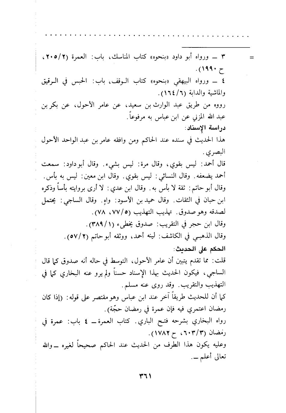 قلت: مما تقدم يتبين أن عامر الأحول، التوسط في حاله أنه صدوق كما قال الساجي، فيكون الحديث بهذا الِإسناد حسناً ولم يرو عنه البخاري كما في التهذيب والتقريب. وقد روى عنه مسلم.