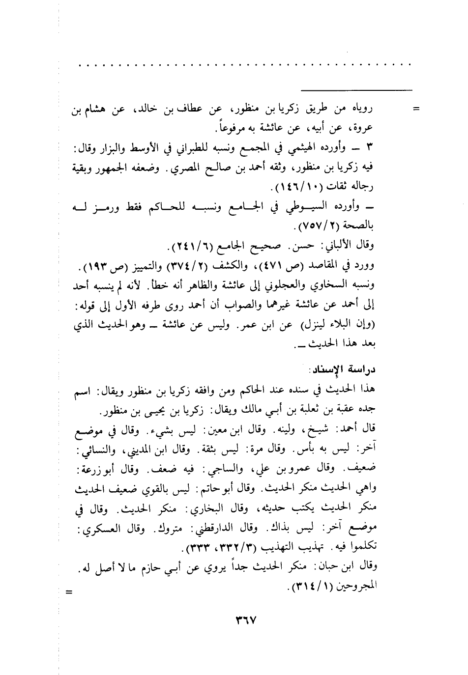 = روياه من طريق زكريا بن منظور، عن عطاف بن خالد، عن هشام بن عروة، عن أبيه، عن عائشة به مرفوعاً.