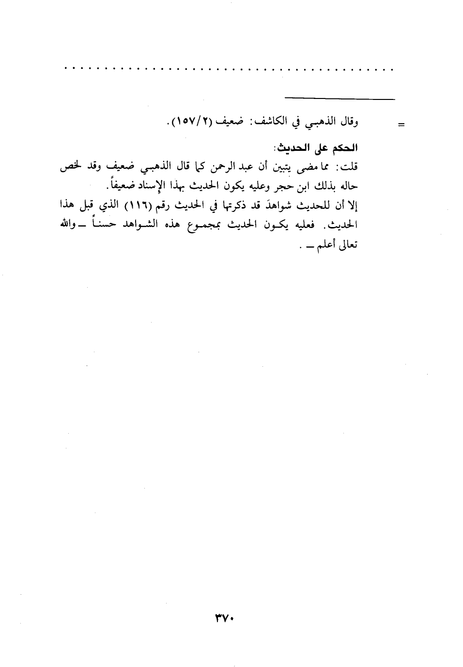 قلت: مما مضى يتبين أن عبد الرحمن كما قال الذهبي ضعيف وقد لخص حاله بذلك ابن حجر وعليه يكون الحديث بهذا الِإسناد ضعيفاً.