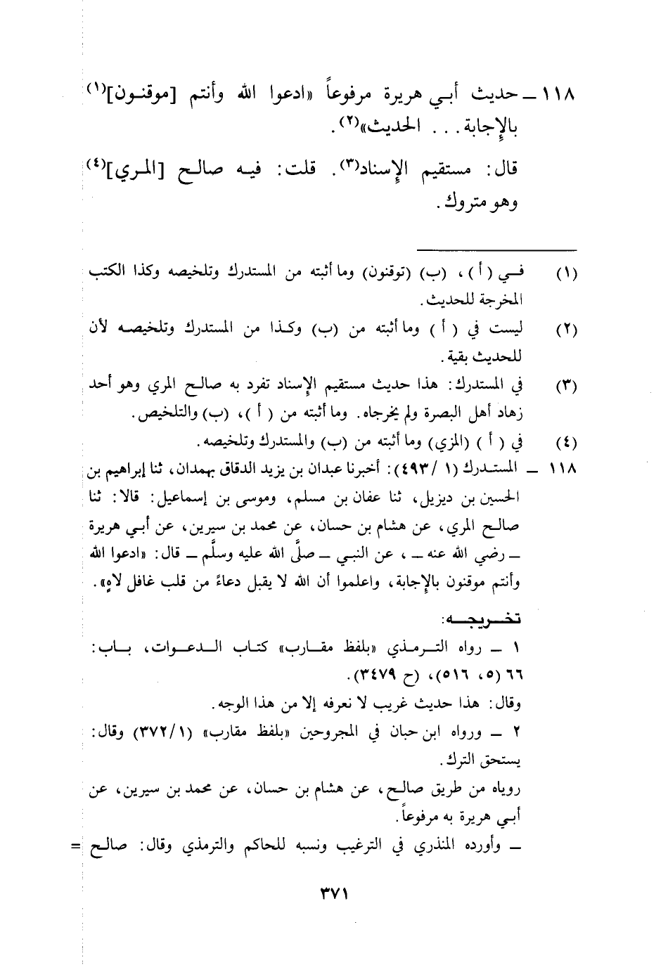 118 - المستدرك (1/ 493): أخبرنا عبدان بن يزيد الدقاق بهمدان، ثنا إبراهيم بن الحسين بن ديزيل، ثنا عفان بن مسلم، وموسى بن إسماعيل: قالا: ثنا صالح المري، عن هشام بن حسان، عن محمد بن سيرين، عن أبي هريرة -رضي الله عنه-، عن النبي -صلى الله عليه وسلم- قال: "ادعوا الله وأنتم موقنون بالِإجابة، واعلموا أن الله لا يقبل دعاءً من قلب غافل لاهٍ".