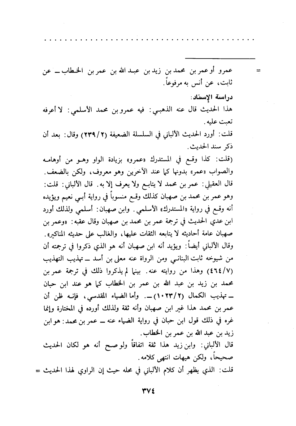 وقال الألباني أيضاً: ويؤيد أنه ابن صهبان أنه هو الذي ذكروا في ترجمته أن من شيوخه ثابت البناني ومن الرواة عنه معلى بن أسد- تهذيب التهذيب (7/ 464) وهذا من روايته عنه. بينما لم يذكروا ذلك في ترجمة عمر بن محمد بن زيد بن عبد الله بن عمر بن الخطاب كما هو عند ابن حبان -تهذيب الكمال (2/ 1023) -. وأما الضياء المقدسي، فإنه ظن أن عمر بن محمد هذا غير ابن صهبان وأنه ثقة ولذلك أورده في المختارة وإنما غره في ذلك قول ابن حبان في رواية الضياء عنه- عمر بن محمد: هو ابن زيد بن عبد الله بن عمر بن الخطاب.