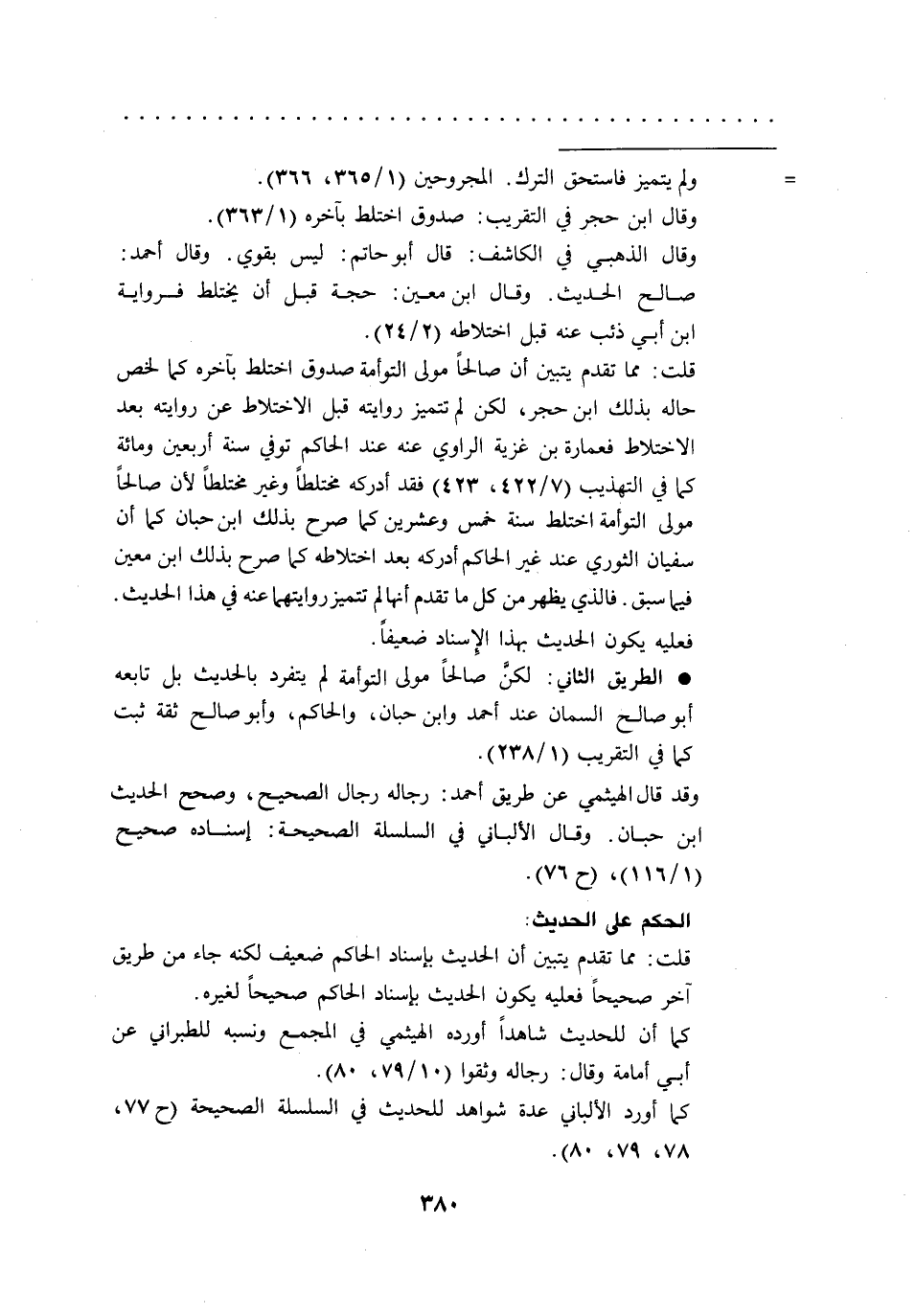 قلت: مما تقدم يتبين أن صالحاً مولى التوأمة صدوق اختلط بآخره كما لخص حاله بذلك ابن حجر، لكن لم تتميز روايته قبل الاختلاط عن روايته بعد الاختلاط فعمارة بن غزية الراوي عنه عند الحاكم توفي سنة أربعين ومائة كما في التهذيب (7/ 422، 423) فقد أدركه مختلطاً وغير مختلطاً لأن صالحاً مولى التوأمة اختلط سنة خمس وعشرين كما صرح بذلك ابن حبان كما أن سفيان الثوري عد غير الحاكم أدركه بعد اختلاطه كما صرح بذلك ابن معين فيما سبق. فالذي يظهر من كل ما تقدم أنها لم تتميز روايتهما عنه في هذا الحديث.