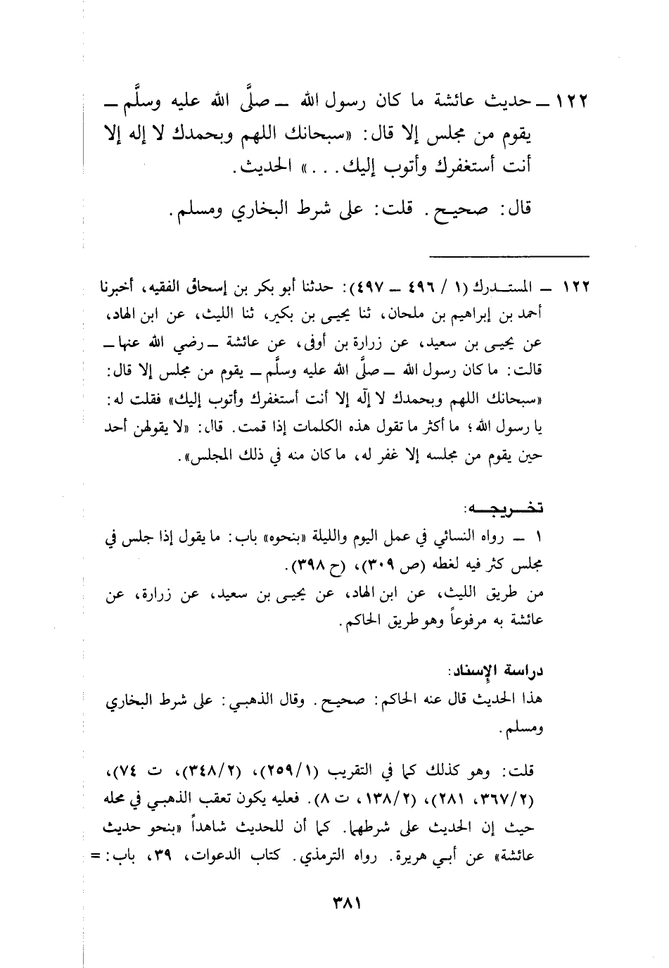 122 - المستدرك (1/ 496 - 497): حدثنا أبو بكر بن إسحاق الفقيه، أخبرنا أحمد بن إبراهيم بن ملحان، ثنا يحيى بن بكير، ثنا الليث، عن ابن الهاد، عن يحيى بن سعيد، عن زرارة بن أوفي، عن عائشة -رضي الله عنها- قالت: ما كان رسول الله -صلى الله عليه وسلم- يقوم من مجلس إلا قال: "سبحانك اللهم وبحمدك لا إله إلا أنت أستغفرك وأتوب إليك، فقلت له: يا رسول الله؛ ما أكثر ما تقول هذه الكلمات إذا قمت. قال: "لا يقولهن أحد حين يقوم من مجلسه إلا غفر له، ما كان منه في ذلك المجلس".
