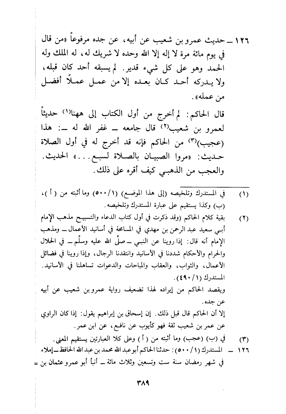 قال الحاكم: لم أخرج من أول الكتاب إلى ههنا (¬1) حديثاً لعمرو بن شعيب (¬2) قال جامعه -غفر الله له-: هذا (عجيب) (¬3) من الحاكم فإنه قد أخرج له في أول الصلاة حديث: "مروا الصبيان بالصلاة لسبع ... " الحديث.