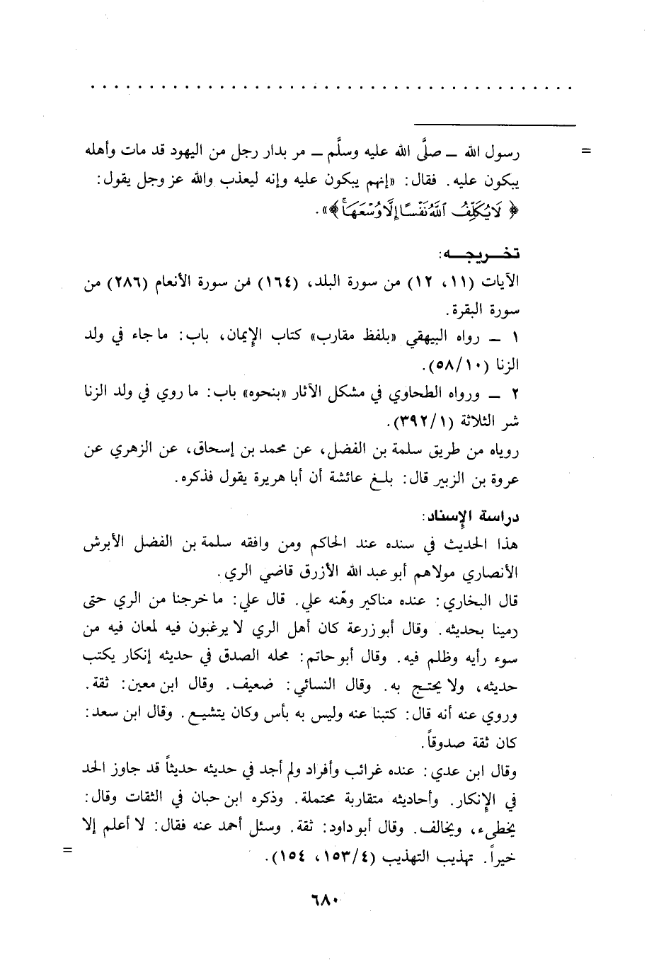 = رسول الله -صلى الله عليه وسلم- مر بدار رجل من اليهود قد مات وأهله يبكون عليه. فقال: "إنهم يبكون عليه وإنه ليعذب والله عز وجل يقول: {لَا يُكِلِّف اَللهُ نَفْسًا إلا وُسْعَهَا} ".