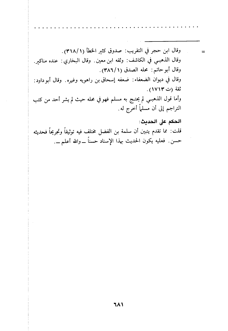 قلت: مما تقدم يتبين أن سلمة بن الفضل مختلف. فيه توثيقاً وتجريحاً فحديثه حسن. فعليه يكون الحديث بهذا الِإسناد حسناً -والله أعلم-.