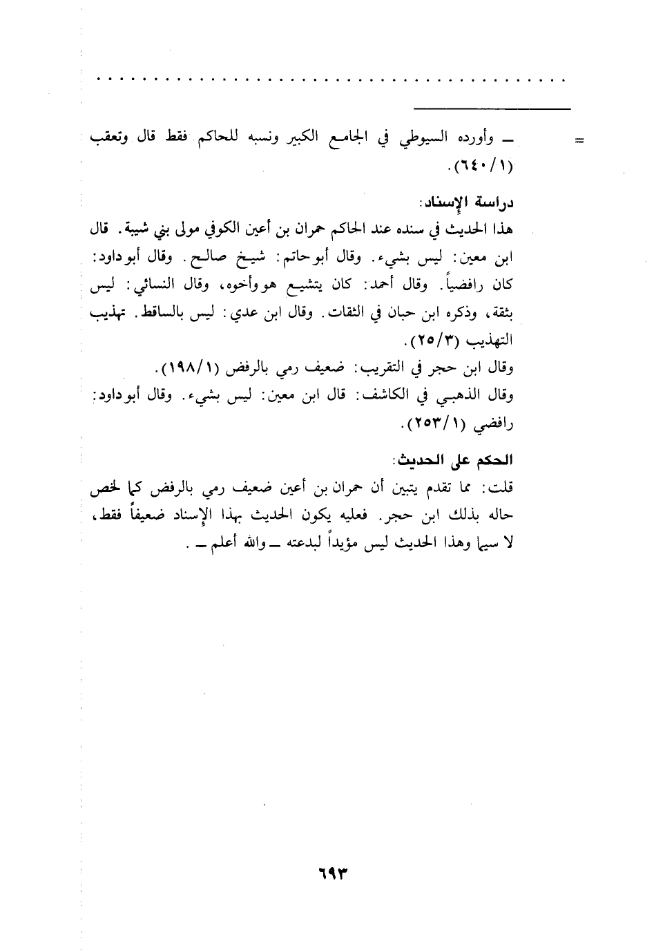 قلت: مما تقدم يتبين أن حمران بن أعين ضعيف رمي بالرفض كما لخص حاله بذلك ابن حجر. فعليه يكون الحديث بهذا الِإسناد ضعيفاً فقط، لا سيما وهذا الحديث ليس مؤيداً لبدعته -والله أعلم-.