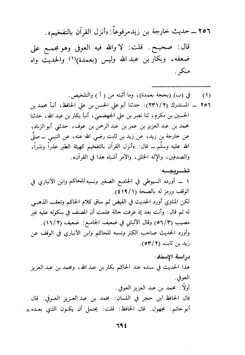 256 - المستدرك (2/ 231): حدثنا أبو علي الحسن بن علي الحافظ، أنبأ محمد بن الحسين بن مكرم، ثنا نصر بن علي الجهضمي، أنبأ بكار بن عبد الله، حدثنا محمد بن عبد العزيز بن عمر بن عبد الرحمن بن عوف، حدثني أبو الزناد، عن خارجة بن زيد، عن زيد بن ثابت رضي الله عنه، عن النبي - صلى الله عليه وسلم - قال: " أنزل القرآن بالتفخيم كهيئة الطير عذراً ونذراً، والصدفين، والِإله الخلق، والأمر أشباه هذا في القرآن".