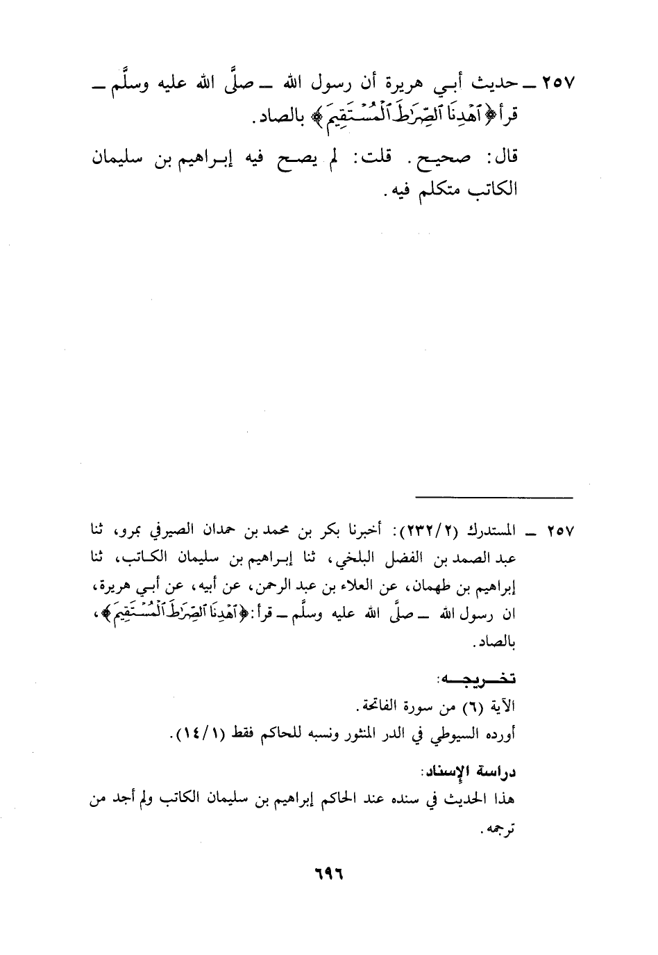 257 - المستدرك (2/ 232): أخبرنا بكر بن محمد بن حمدان الصيرفي بمرو، ثنا عبد الصمد بن الفضل البلخي، ثنا إبراهيم بن سليمان الكاتب، ثنا إبراهيم بن طهمان، عن العلاء بن عبد الرحمن، عن أبيه، عن أبي هريرة، أن رسول الله- صلى الله عليه وسلم- قرأ: {اهْدِنَا الصِّرَاطَ الْمُسْتَقِيمَ (6)} [الفاتحة: 6]، بالصاد.