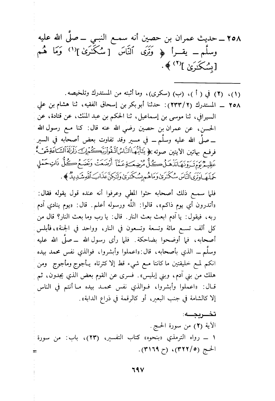 258 - حديث عمران بن حصين أنه سمع النبي -صلَّى الله عليه وسلَّم- يقرأ {وَتَرَى النَّاسَ [سُكَرَى] (¬1) وَمَا هُمْ [بِسُكَرَى] (¬2)} [الحج: 2].
