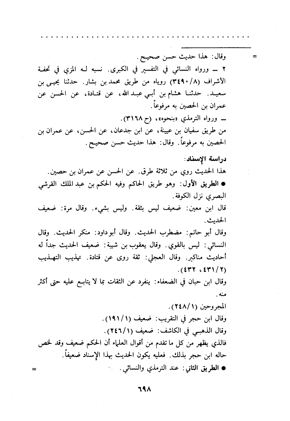 2 - ورواه النسائي في التفسير في الكبرى. نسبه له المزي في تحفة الأشراف (8/ 3490) روياه من طريق محمد بن بشار. حدثنا يحيى بن سعيد. حدثنا هشام بن أبي عبد الله، عن قتادة، عن الحسن عن عمران بن الحصين به مرفوعاً.