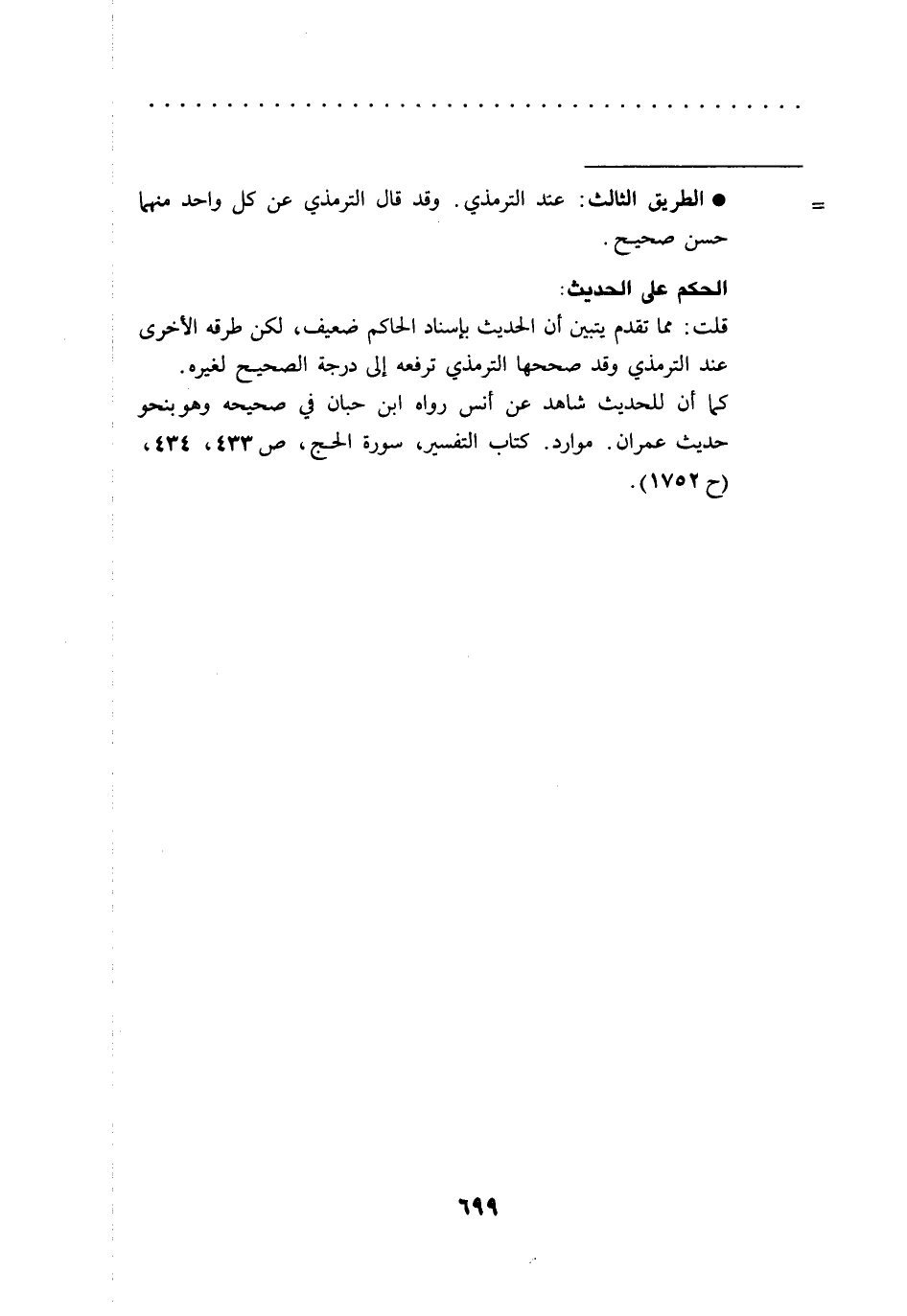 كما أن للحديث شاهد عن أنس رواه ابن حبان في صحيحه وهو بنحو حديث عمران. موارد. كتاب التفسير، سورة الحج، ص 433، 434، (ح 1752).