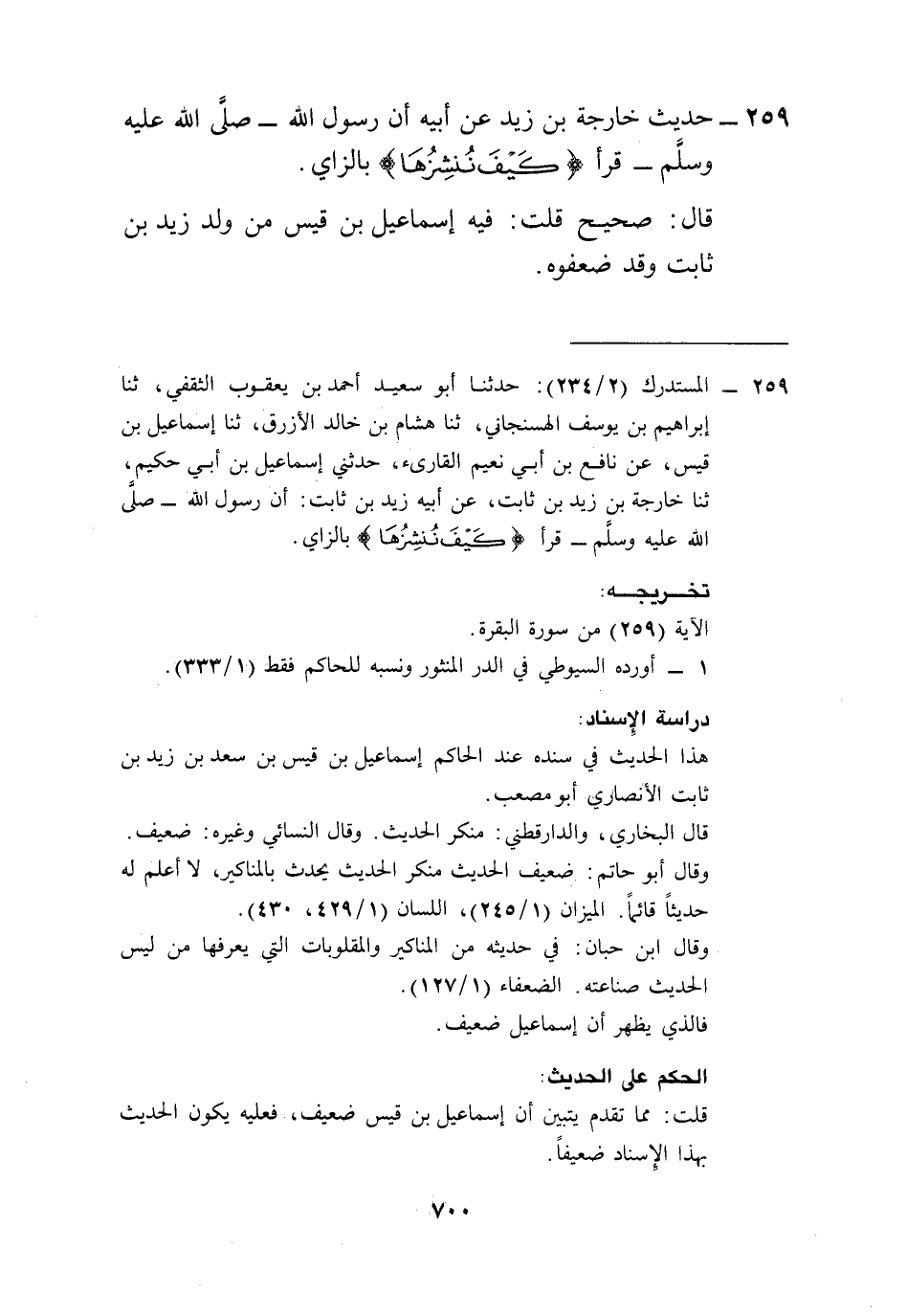 259 - المستدرك (2/ 234): حدثنا أبو سعيد أحمد بن يعقوب الثقفي، ثنا إبراهيم بن يوسف الهسنجاني، ثنا هشام بن خالد الأزرق، ثنا إسماعيل بن قيس، عن نافع بن أبي نعيم القارىء، حدثني إسماعيل بن أبي حكيم، ثنا خارجة بن زيد بن ثابت، عن أبيه زيد بن ثابت: أن رسول الله -صلى الله عليه وسلَّم- قرأ {كيفَ نُنشِزُهَا} بالزاي.