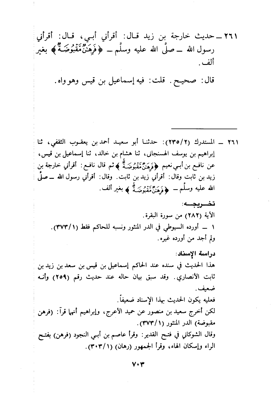 261 - المستدرك (2/ 235): حدثنا أبو سعيد أحمد بن يعقوب الثقفي، ثنا إبراهيم بن يوسف الهسنجانى، ثنا هشام بن خالد، ثنا إسماعيل بن قيس، عن نافع بن أبي نعيم {فَرِهَانٌ مَقْبُوضَةٌ (283)} [البقرة: 283] ثم قال نافع: أقرأني خارجة بن زيد بن ثابت وقال: أقرأني زيد بن ثابت. وقال: أقرأني رسول الله -صلى الله عليه وسلم- {فَرِهَانٌ مَقْبُوضَةٌ (283)} [البقرة: 283] بغير ألف.