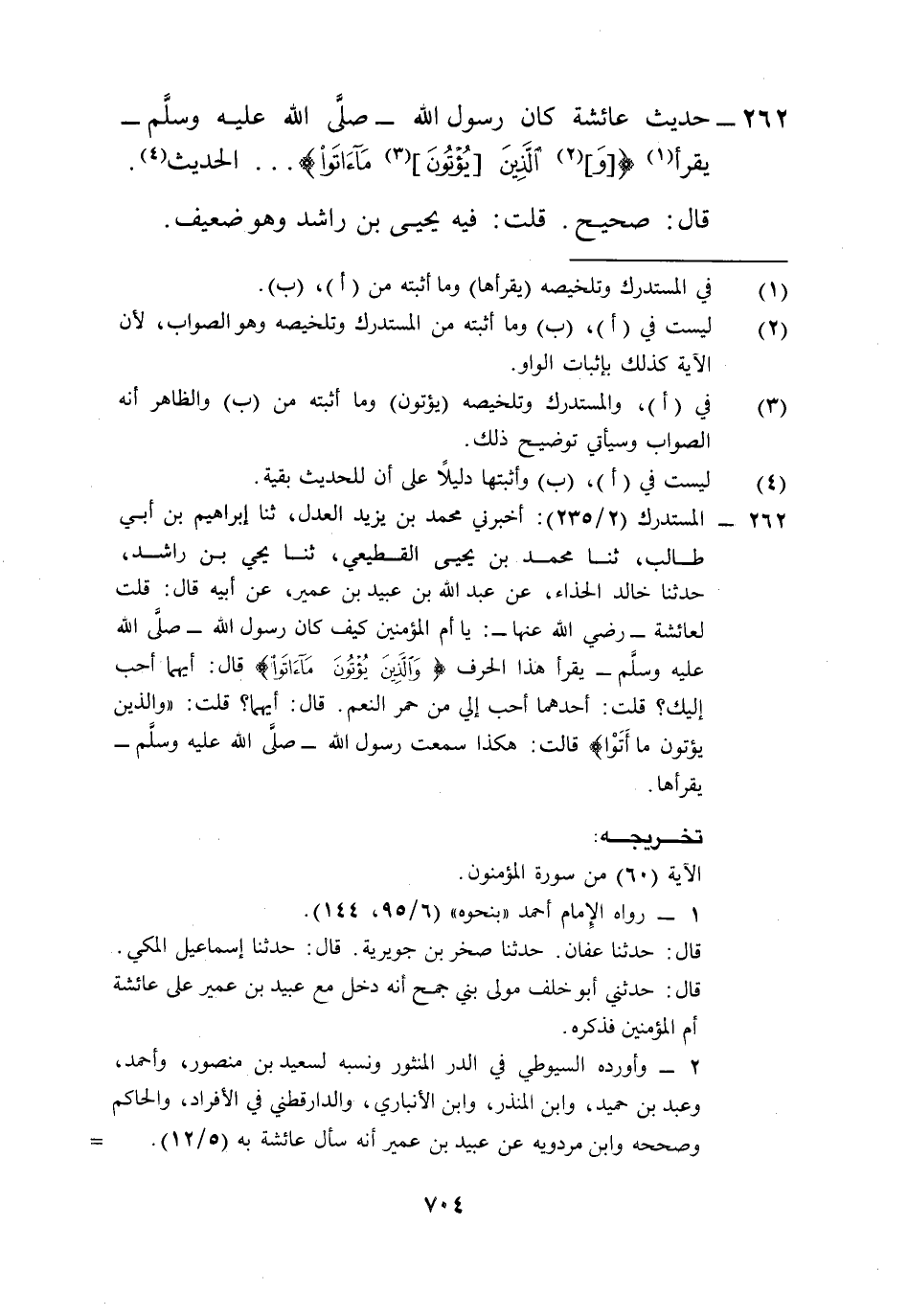 262 - المستدرك (2/ 235): أخبرني محمد بن يزيد العدل، ثنا إبراهيم بن أبي طالب، ثنا محمد بن يحيى القطيعي، ثنا يحيي بن راشد، حدثنا خالد الحذاء، عن عبد الله بن عبيد بن عمير، عن أبيه قال: قلت لعائشة -رضي الله عنها-: يا أم المؤمنين كيف كان رسول الله -صلى الله عليه وسلم- يقرأ هذا الحرف (وَالًذِينَ يُؤتوُن مَآ ءاتَوا} قال: أيهما أحب إليك؟ قلت: أحدهما أحب إلي من حمر النعم. قال: أيهما؟ قلت: {والذين يؤتون ما أَتَوْا} قالت: هكذا سمعت رسول الله -صلى الله عليه وسلم- يقرأها.