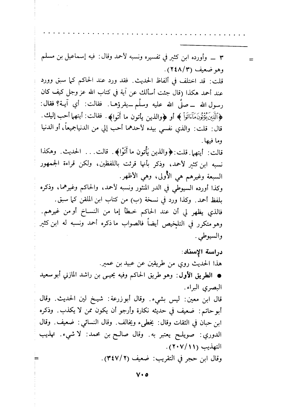قلت: قد اختلف في ألفاظ الحديث. فقد ورد عند الحاكم كما سبق وورد عند أحمد هكذا (قال جئت أسألك عن آية في كتاب الله عز وجل كيف كان رسول الله -صلى الله عليه وسلم- يقرؤها. فقالت: أي آية؟ فقال: {اَلَّذِينَ يُؤتوُنَ مَآءَاتَوا} أو (والذين يأتون ما أَتَوا}. فقالت: أيتهما أحب إليك. قال: قلت: والذي نفسي بيده لأحدهما أحب إلي من الدنيا جميعاً، أو الدنيا وما فيها.