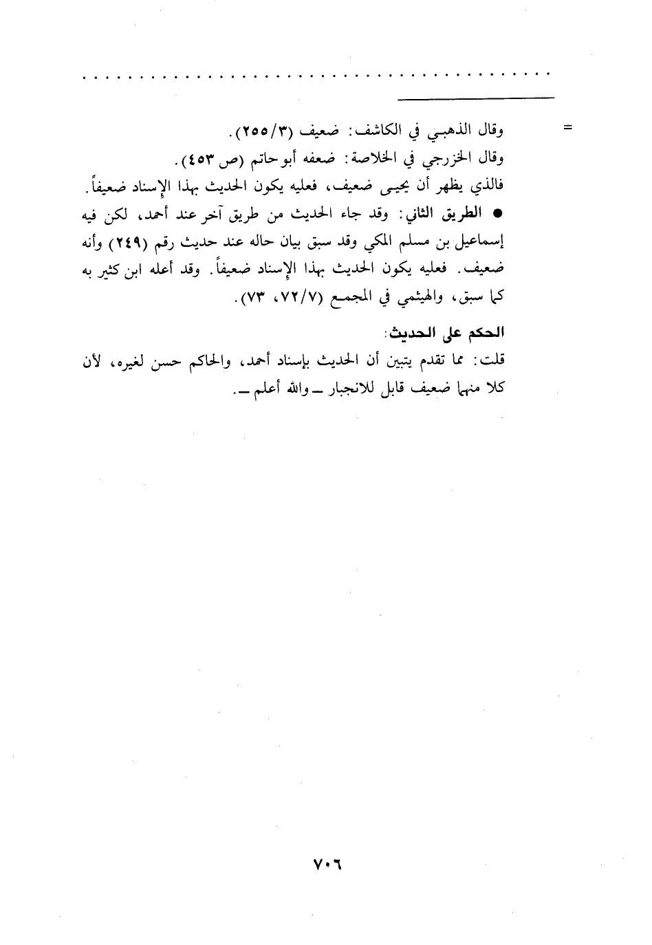 * الطريق الثاني: وقد جاء الحديث من طريق آخر عند أحمد، لكن فيه إسماعيل بن مسلم المكي وقد سبق بيان حاله عند حديث رقم (249) وأنه ضعيف. فعليه يكون الحديث بهذا الإِسناد ضعيفاً. وقد أعله ابن كثير به كما سبق، والهيثمي في المجمع (7/ 72، 73).