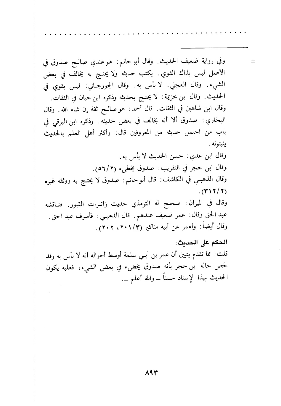 وقال في الميزان: صحح له الترمذي حديث زائرات القبور. فناقشه عبد الحق وقال: عمر ضعيف عندهم. قال الذهبي: فأسرف عبد الحق.