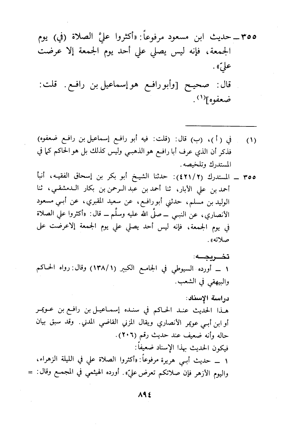 355 - المستدرك (2/ 421): حدثنا الشيخ أبو بكر بن إسحاق الفقيه، أنبأ أحمد بن علي الأبار، ثنا أحمد بن عبد الرحمن بن بكار الدمشقي، ثنا الوليد بن مسلم، حدثني أبو رافع، عن سعيد المقبري، عن أبي مسعود الأنصاري، عن النبي -صلى الله عليه وسلم- قال: "أكثروا علي الصلاة في يوم الجمعة، فإنه ليس أحد يصلي علي يوم الجمعة إلا عرضت على صلاته".