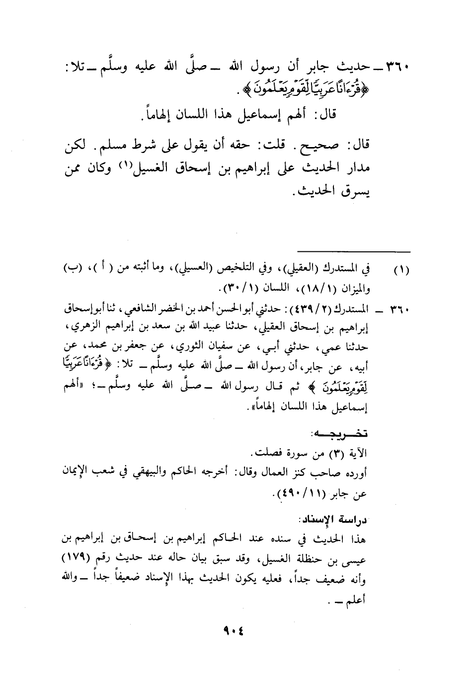 360 - المستدرك (2/ 439): حدثني أبو الحسن أحمد بن الخضر الشافعي، ثنا أبو إسحاق إبراهيم بن إسحاق العقيلي، حدثنا عبيد الله بن سعد بن إبراهيم الزهري، حدثنا عمي، حدثني أبي، عن سفيان الثوري، عن جعفر بن محمد، عن أبيه، عن جابر، أن رسول الله -صلى الله عليه وسلم- تلا: {قُرْآنًا عَرَبِيًّا لِقَوْمٍ يَعْلَمُونَ (3)} [فصلت: 3] ثم قال رسول الله -صلى الله عليه وسلم-؛ "ألهم إسماعيل هذا اللسان إلهاماً".