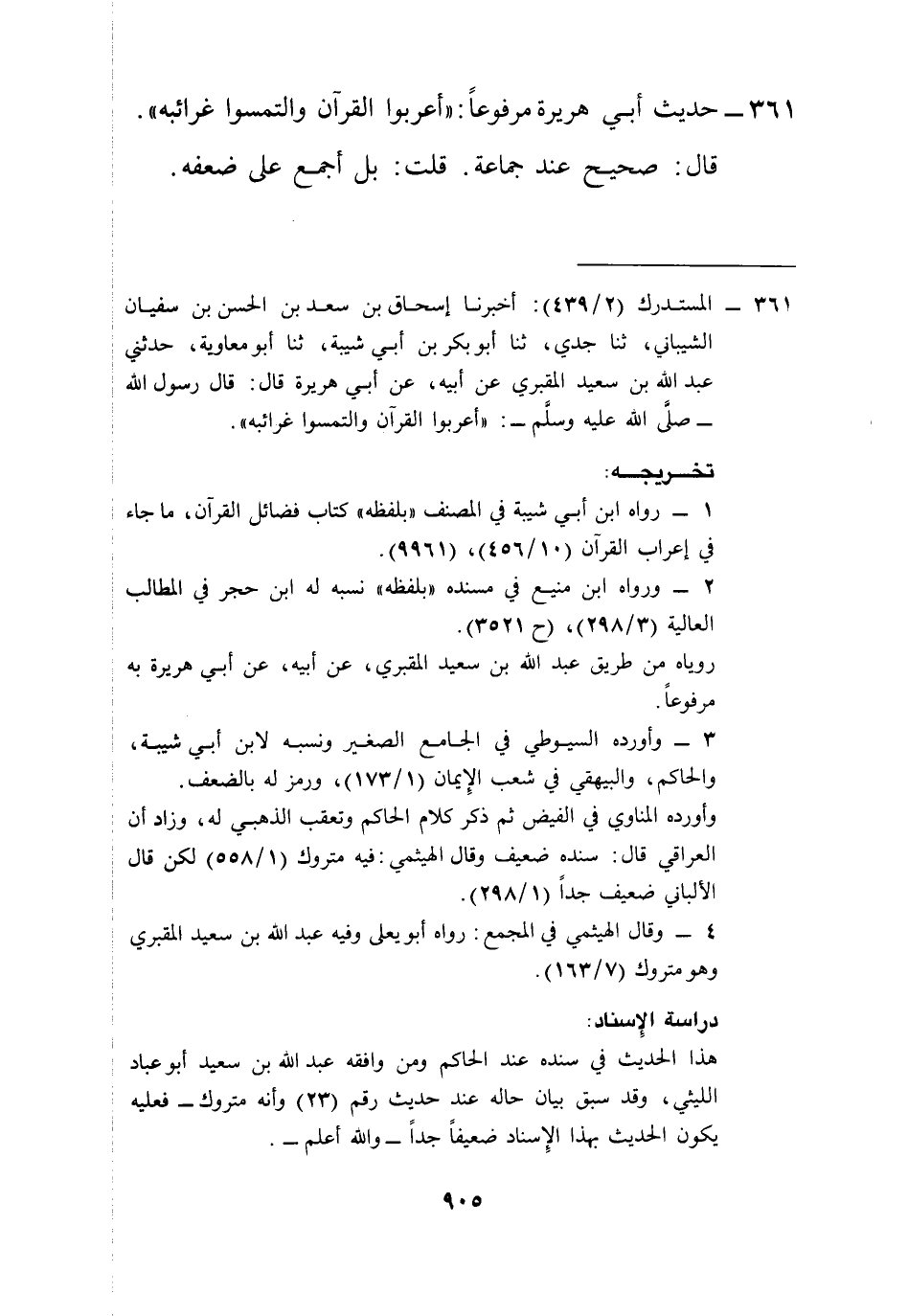 361 - المستدرك (2/ 439): أخبرنا إسحاق بن سعد بن الحسن بن سفيان الشيباني، ثنا جدي، ثنا أبو بكر بن أبي شيبة، ثنا أبو معاوية، حدثني عبد الله بن سعيد المقبري عن أبيه، عن أبي هريرة قال: قال رسول الله -صلى الله عليه وسلم-: "أعربوا القرآن والتمسوا غرائبه".