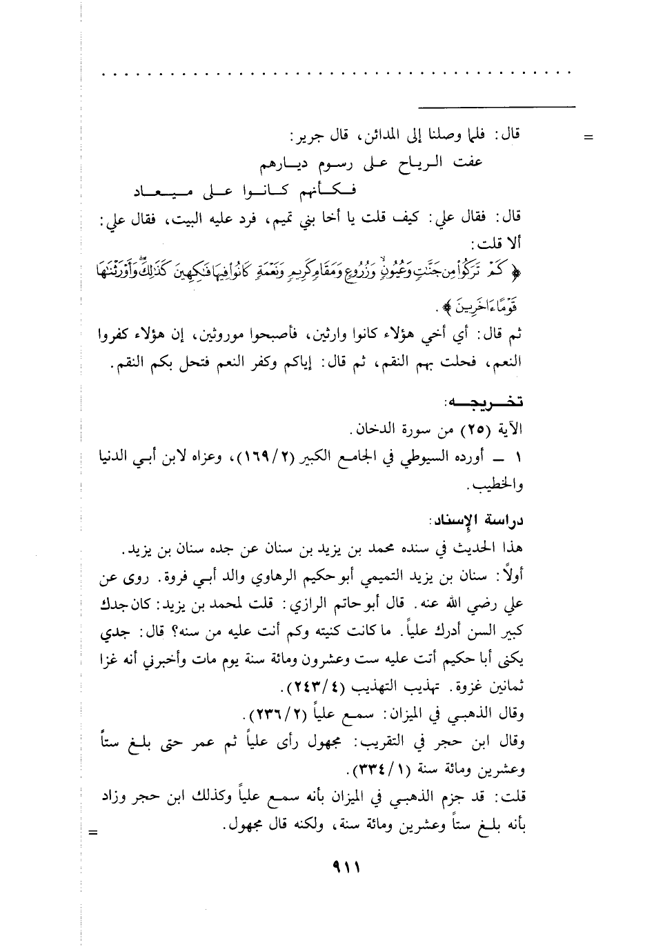 أولاً: سنان بن يزيد التميمي أبو حكيم الرهاوي والد أبي فروة. روى عن علي رضي الله عنه. قال أبو حاتم الرازي: قلت لمحمد بن يزيد: كان جدك كبير السن أدرك علياً. ما كانت كنيته وكم أنت عليه من سنه؟ قال: جدي يكنى أبا حكيم أتت عليه ست وعشرون ومائة سنة يوم مات وأخبرني أنه غزا ثمانين غزوة. تهذيب التهذيب (4/ 243).