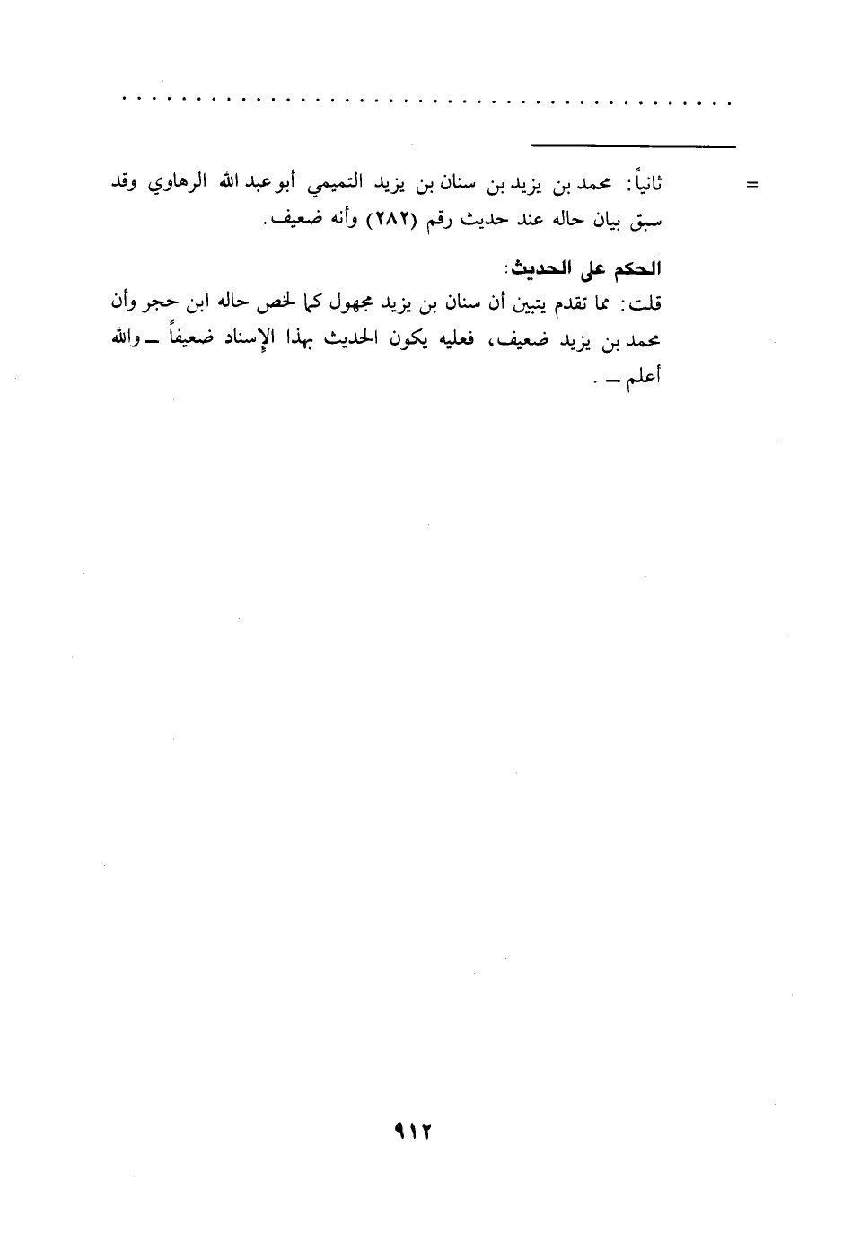 = ثانياً: محمد بن يزيد بن سنان بن يزيد التميمي أبو عبد الله الرهاوي وقد سبق بيان حاله عند حديث رقم (282) وأنه ضعيف.
