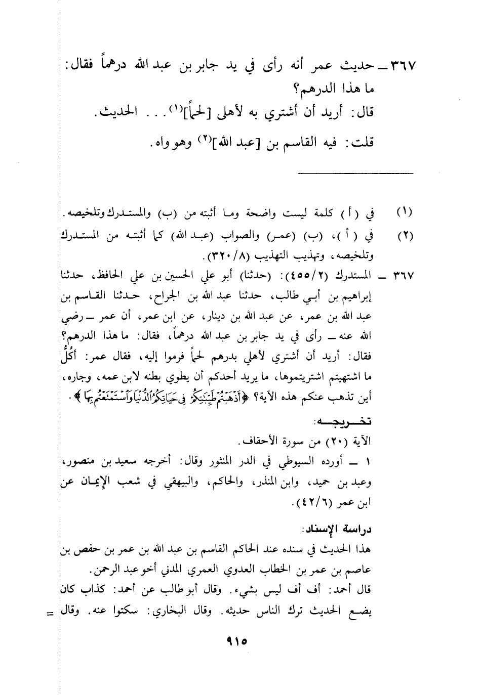 367 - المستدرك (2/ 455): (حدثنا) أبو علي الحسين بن علي الحافظ، حدثنا إبراهيم بن أبي طالب، حدثنا عبد الله بن الجراح، حدثنا القاسم بن عبد الله بن عمر، عن عبد الله بن دينار، عن ابن عمر، أن عمر- رضي الله عنه- رأى في يد جابر بن عبد الله درهماً، فقال: ما هذا الدرهم؟ فقال: أريد أن أشتري لأهلي بدرهم لحماً فرموا إليه، فقال عمر: أكُلُّ ما اشتهيتم اشتريتموها، ما يريد أحدكم أن يطوي بطنه لابن عمه، وجاره، أين تذهب عنكم هذه الآية؟ {أذهبتم طيباتكم في حياتكم الدنيا واستمتعتم بها}.