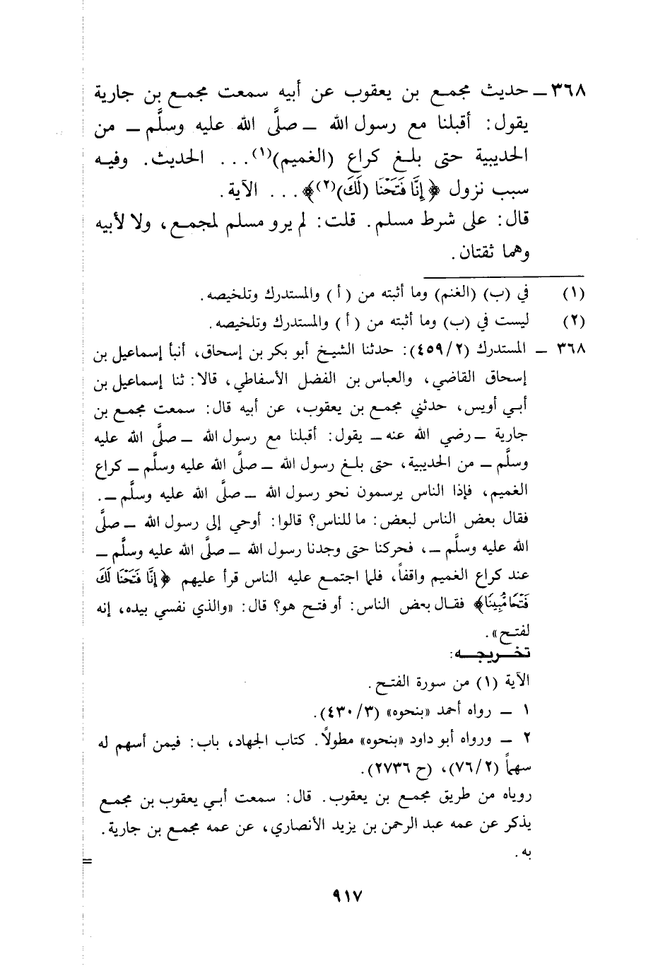368 - حديث مجمع بن يعقوب عن أبيه سمعت مجمع بن جارية يقول: أقبلنا مع رسول الله -صلَّى الله عليه وسلَّم- من الحديبية حتى بلغ كراع (الغميم) (¬1) ... الحديث. وفيه سبب نزول {إِنَّا فتَحْنَا لَكَ (¬2)} ... الآية.