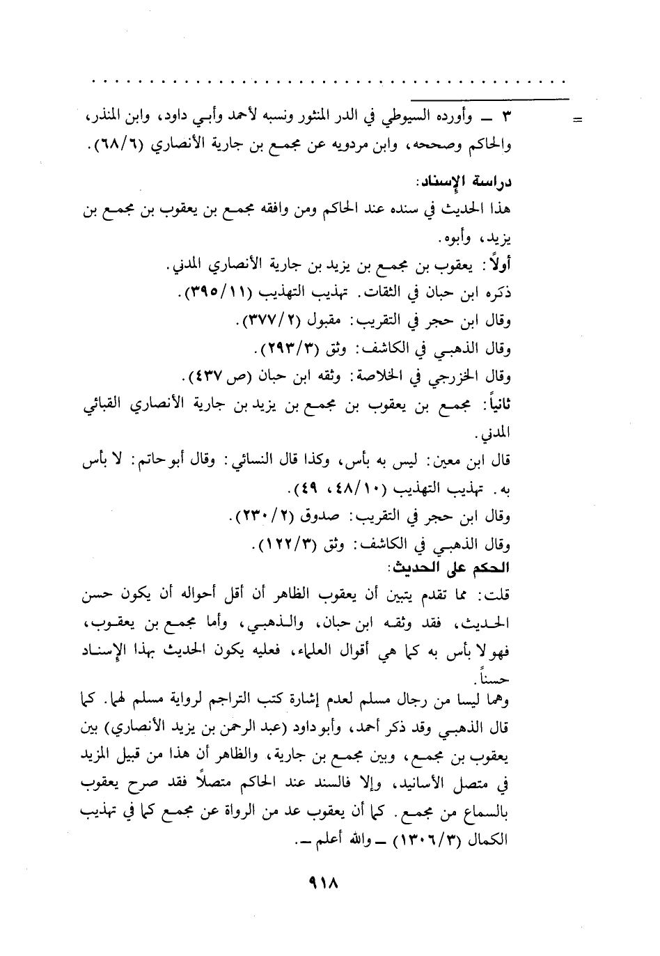 وهما ليسا من رجال مسلم لعدم إشارة كتب التراجم لرواية مسلم لهما. كما قال الذهبي وقد ذكر أحمد، وأبو داود (عبد الرحمن بن يزيد الأنصاري) بين يعقوب بن مجمع، وبين مجمع بن جارية، والظاهر أن هذا من قبيل المزيد في متصل الأسانيد، وإلا فالسند عند الحاكم متصلاً فقد صرح يعقوب بالسماع من مجمع. كما أن يعقوب عند من الرواة عن مجمع كما في تهذيب الكمال (3/ 1306) -والله أعلم-.