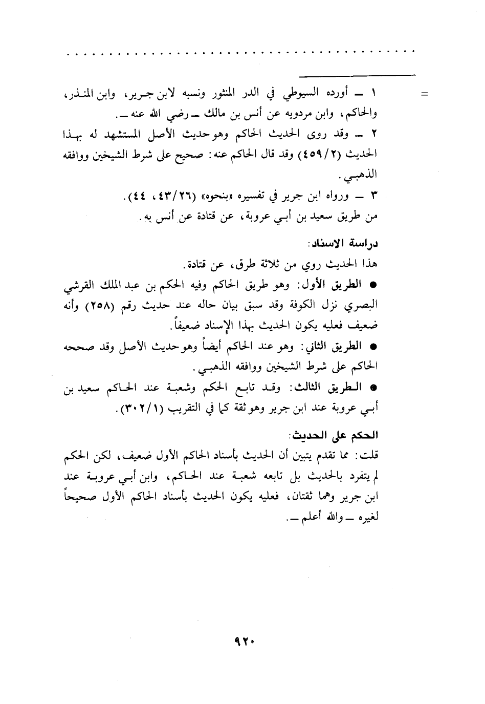 قلت: مما تقدم يتبين أن الحديث بإسناد الحاكم الأول ضعيف، لكن الحكم لم يتفرد بالحديث بل تابعه شعبة عند الحاكم، وابن أبي عروبة عند ابن جرير وهما ثقتان، فعليه يكون الحديث باسناد الحاكم الأول صحيحاً لغيره -والله أعلم-.