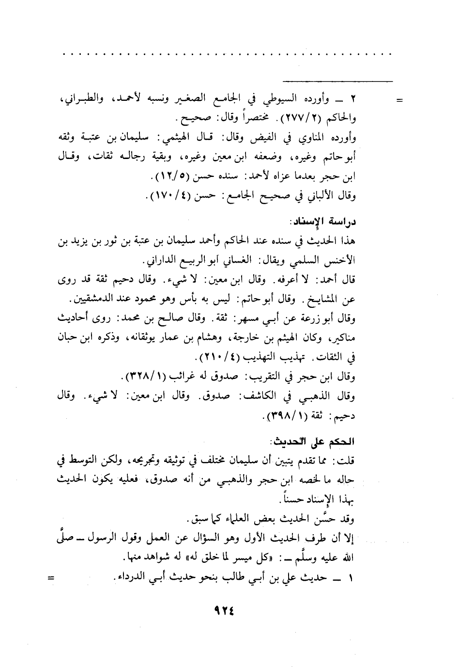 وأورده المناوي في الفيض وقال: قال الهيثمي: سليمان بن عتبة وثقه أبو حاتم وغيره، وضعفه ابن معين وغيره، وبقية رجاله ثقات، وقال ابن حجر بعدما عزاه لأحمد: سنده حسن (5/ 12).