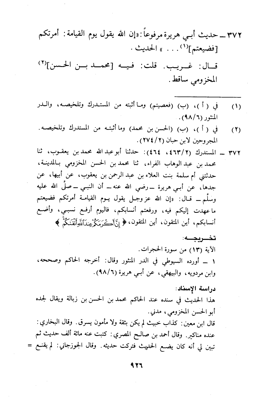 372 - المستدرك (2/ 463، 464): حدثنا أبو عبد الله محمد بن يعقوب، ثنا محمد بن عبد الوهاب الفراء، ثنا محمد بن الحسن المخزومي بالمدينة، حدثتني أم سلمة بنت العلاء بن عبد الرحمن بن يعقوب، عن أبيها، عن جدها، عن أبي هريرة -رضي الله عنه- أن النبي -صلى الله عليه وسلم- قال: "إن الله عز وجل يقول يوم القيامة أمرتكم فضيعتم ما عهدت إليكم فيه، ورفعتم أنسابكم، فاليوم أرفع نسبي، وأضع أنسابكم، أين المتقون، أين المتقون، {إنَّ أَكرَمَكُم عِندَ الله أتقاكم}.