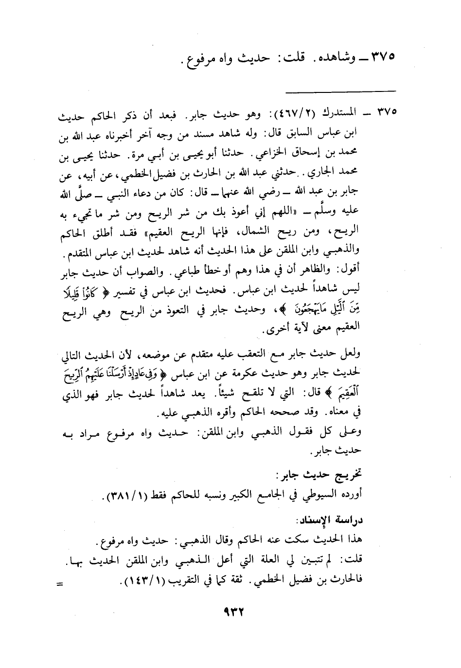 375 - المستدرك (2/ 467): وهو حديث جابر. فبعد أن ذكر الحاكم حديث ابن عباس السابق قال: وله شاهد مسند من وجه آخر أخبرناه عبد الله بن محمد بن إسحاق الخزاعي. حدثنا أبو يحيى بن أبي مرة. حدثنا يحيى بن محمد الجاري .. حدثني عبد الله بن الحارث بن فضيل الخطمي، عن أبيه، عن جابر بن عبد الله -رضي الله عنهما- قال: كان من دعاء النبي -صلى الله عليه وسلم- "اللهم إني أعوذ بك من شر الريح ومن شر ما تجيء به الريح، ومن ريح الشمال، فإنها الريح العقيم" فقد أطلق الحاكم والذهبي وابن الملقن على هذا الحديث أنه شاهد لحديث ابن عباس المتقدم.