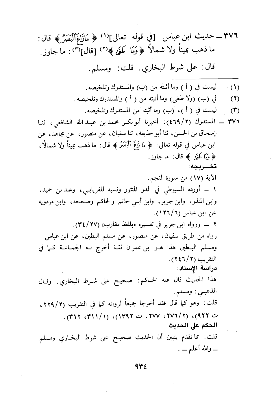 376 - المستدرك (2/ 469): أخبرنا أبو بكر محمد بن عبد الله الشافعي، ثنا إسحاق بن الحسن، ثنا أبو حذيفة، ثنا سفيان، عن منصور، عن مجاهد، عن ابن عباس في قوله تعالى: {مَا زَاغَ اَلبَصرُ} قال: ما ذهب يميناً ولا شمالًا، {وَمَا طَغىَ} قال: ما جاوز.