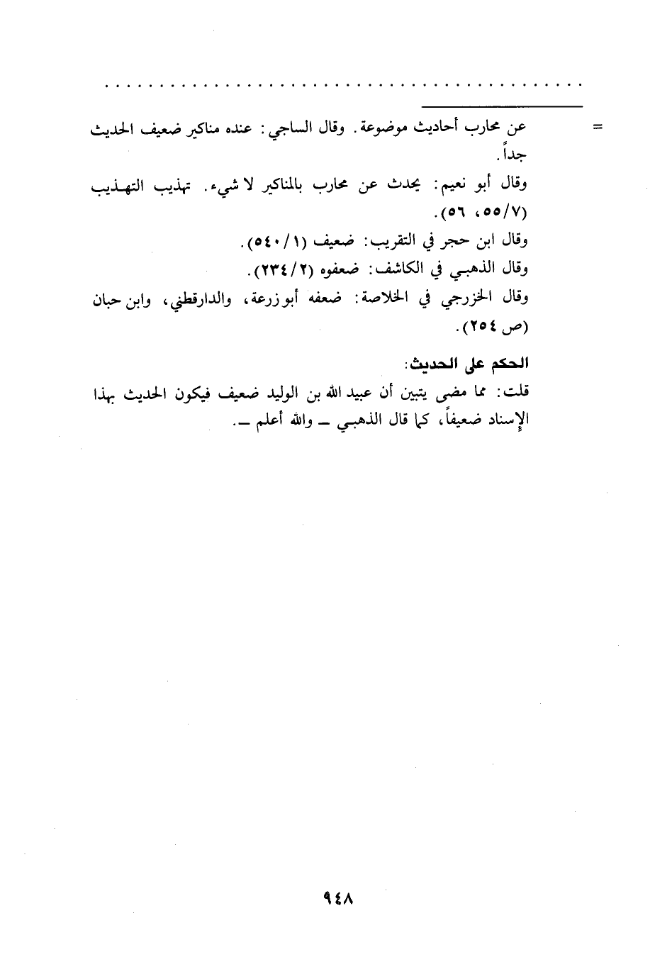 قلت: مما مضى يتبين أن عبيد الله بن الوليد ضعيف فيكون الحديث بهذا الإِسناد ضعيفاً، كما قال الذهبي -والله أعلم-.