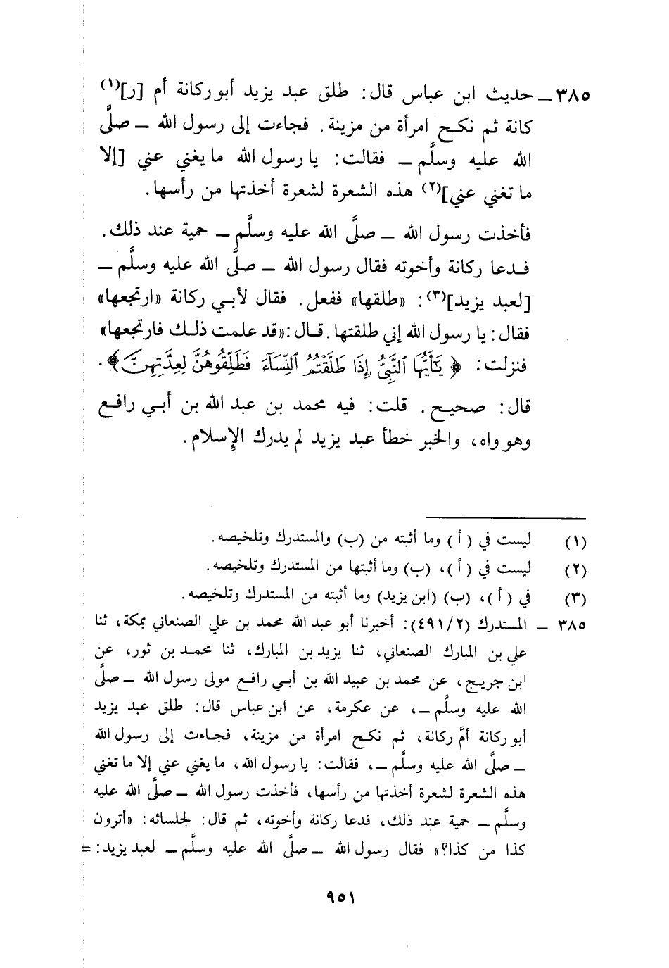 385 - المستدرك (2/ 491): أخبرنا أبو عبد الله محمد بن علي الصنعاني بمكة، ثنا علي بن المبارك الصنعاني، ثنا يزيد بن المبارك، ثنا محمد بن ثور، عن ابن جريج، عن محمد بن عبيد الله بن أبي رافع مولى رسول الله -صلى الله عليه وسلم-، عن عكرمة، عن ابن عباس قال: طلق عبد يزيد أبور كانة أمَّ ركانة، ثم نكح امرأة من مزينة، فجاءت إلى رسول الله -صلى الله عليه وسلم-، فقالت: يا رسول الله، ما يغني عني إلا ما تغني هذه الشعرة لشعرة أخذتها من رأسها، فأخذت رسول الله -صلى الله عليه وسلم- حمية عند ذلك، فدعا ركانة وأخوته، ثم قال: لجلسائه: "أترون كذا من كذا؟ " فقال رسول الله -صلى الله عليه وسلم- لعبد يزيد: =