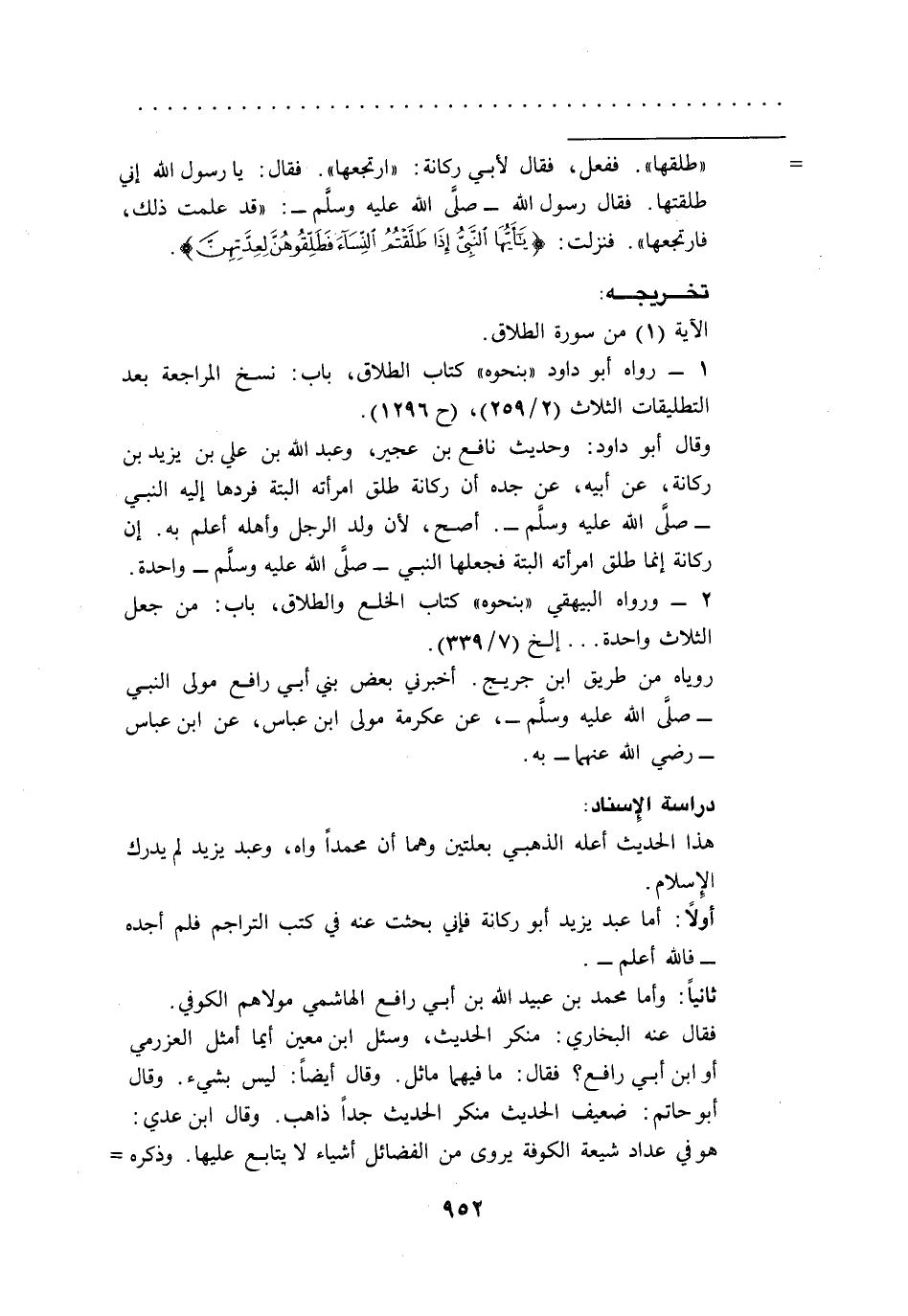 وقال أبو داود: وحديث نافع بن عجير، وعبد الله بن علي بن يزيد بن ركانة، عن أبيه، عن جده أن ركانة طلق امرأته البتة فردها إليه النبي -صلى الله عليه وسلم-. أصح، لأن ولد الرجل وأهله أعلم به. إن ركانة إنما طلق امرأته البتة فجعلها النبي -صلى الله عليه وسلم- واحدة.