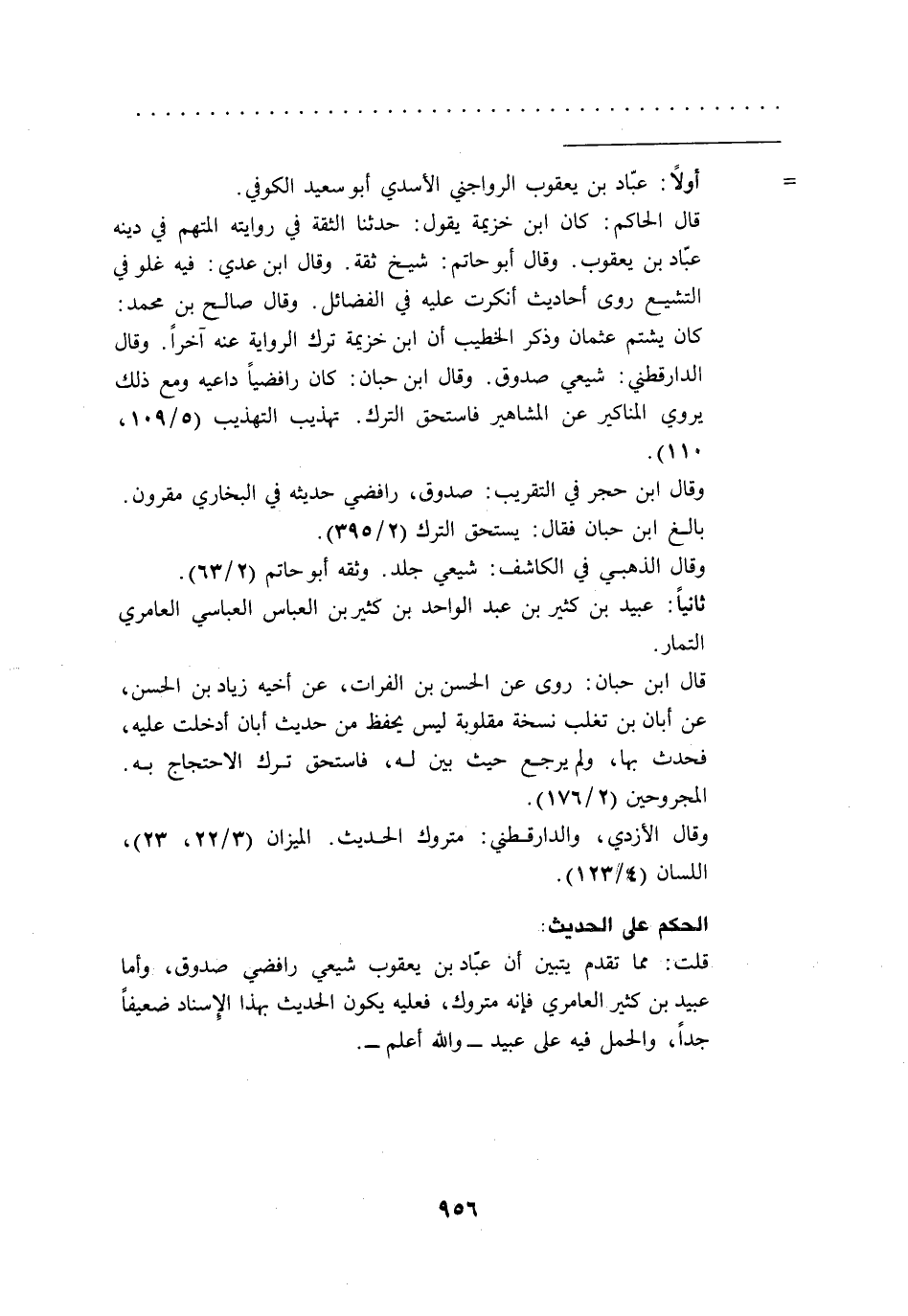 قلت: مما تقدم يتبين أن عبّاد بن يعقوب شيعي رافضي صدوق، وأما عبيد بن كثير العامري فإنه متروك، فعليه يكون الحديث بهذا الِإسناد ضعيفاً جداً، والحمل فيه على عبيد -والله أعلم-.